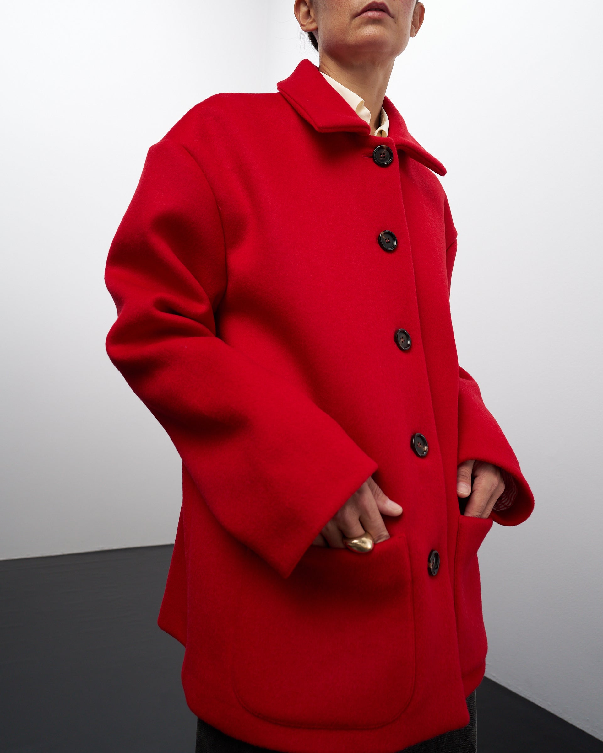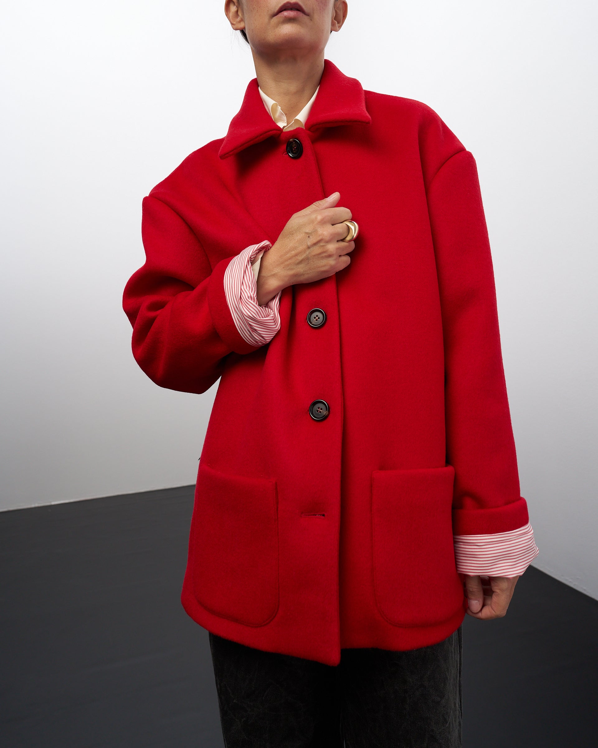 Silhouette ampia, spalle comode e una lunghezza appena sopra il bacino, che lascia liberi i fianchi per un capo dal fascino intramontabile.
