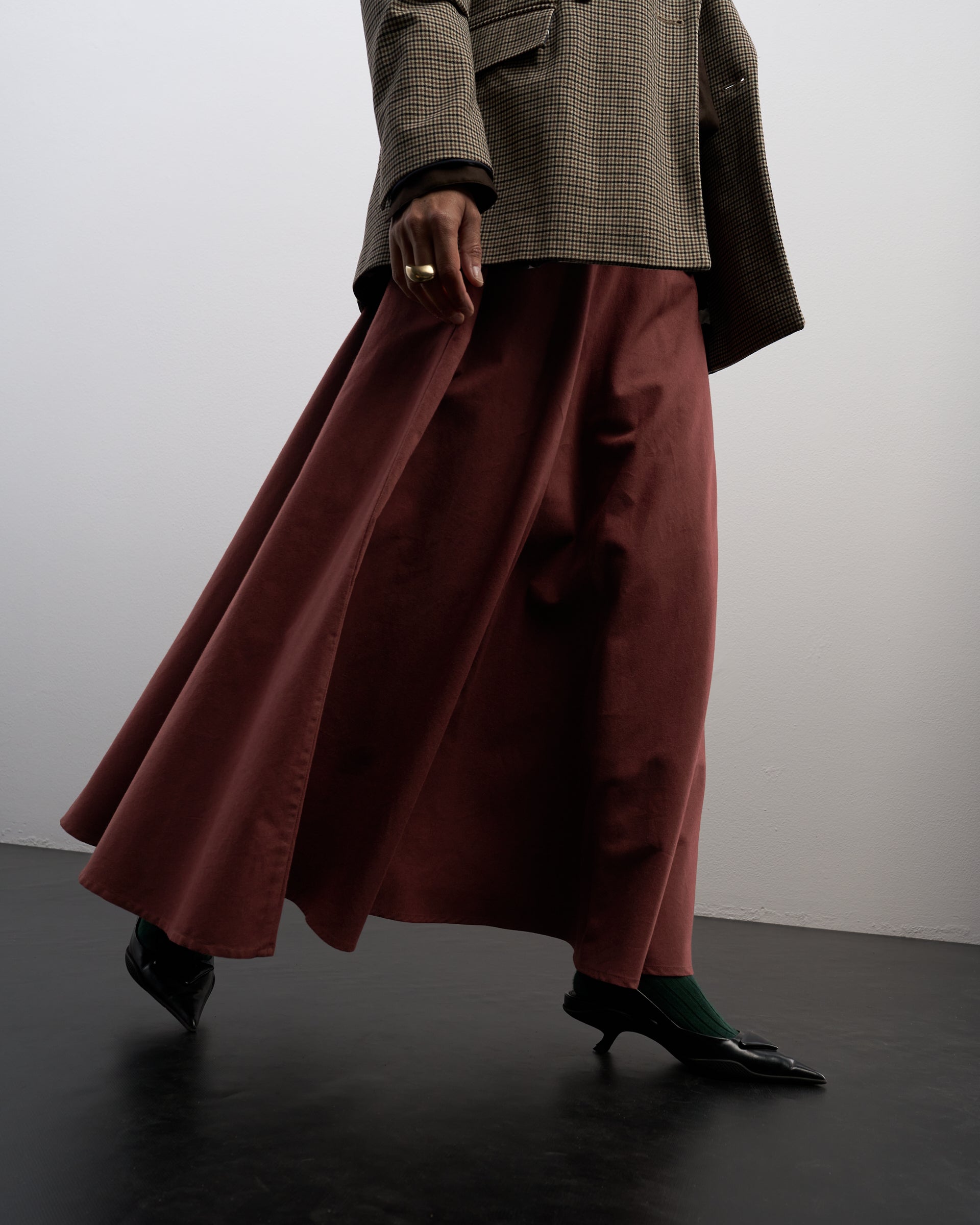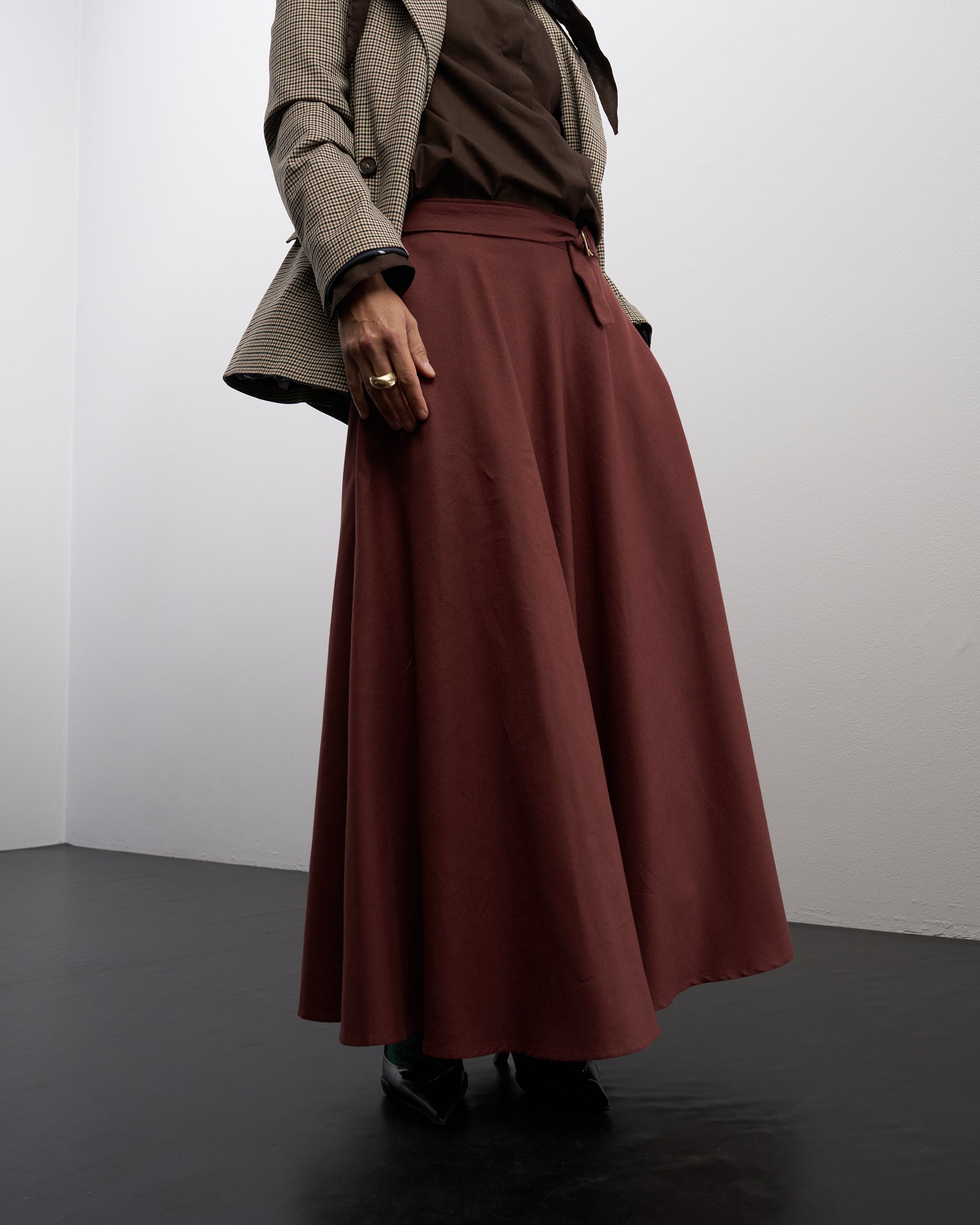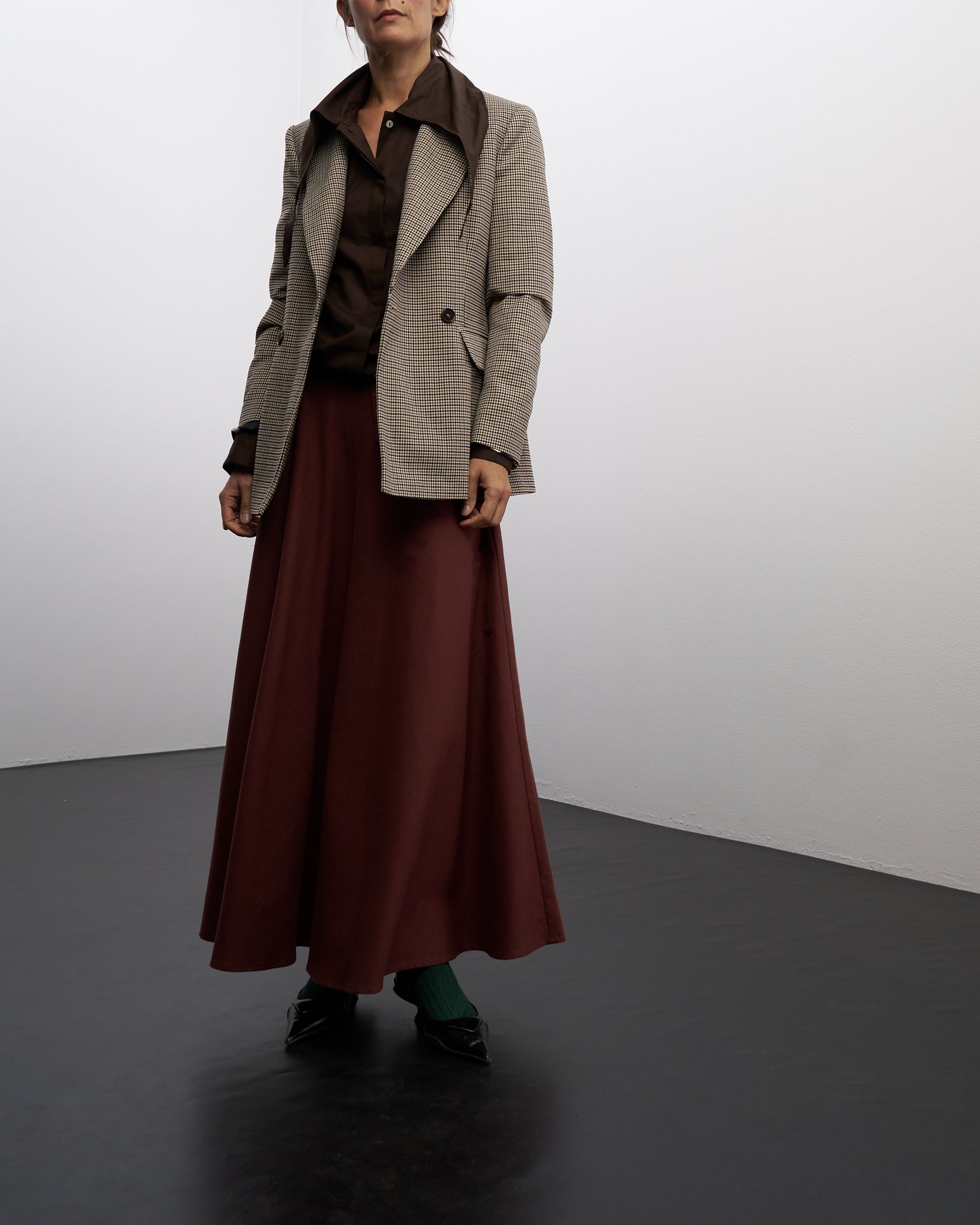 Una gonna a mezza ruota, fluida e leggera, realizzata in morbida flanella, ideale per cadere sul corpo in modo perfetto.