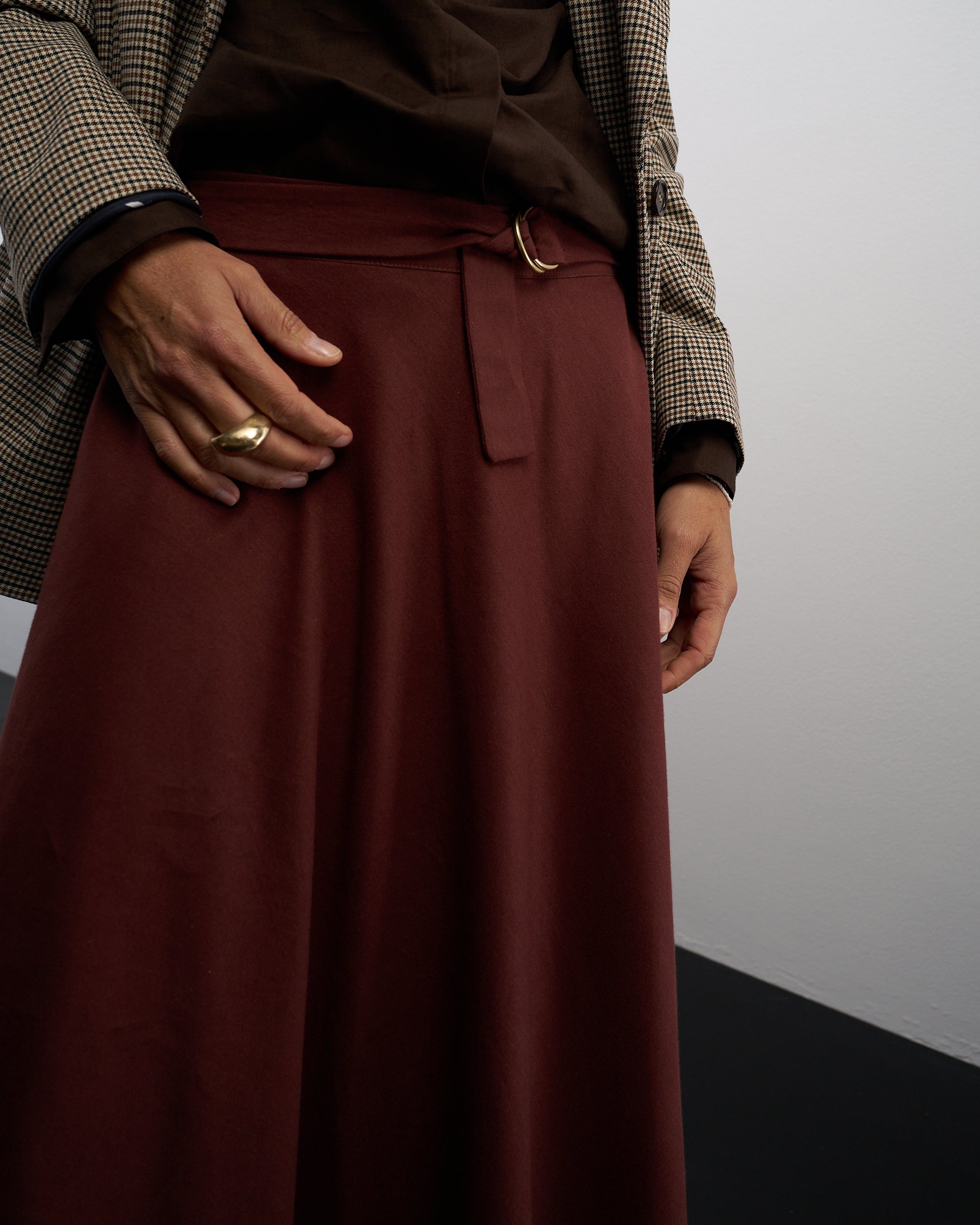 La lunghezza al polpaccio e il dettaglio della fusciacca in vita chiusa con anelli metallici, la rendono una gonna decisamente elegante.
