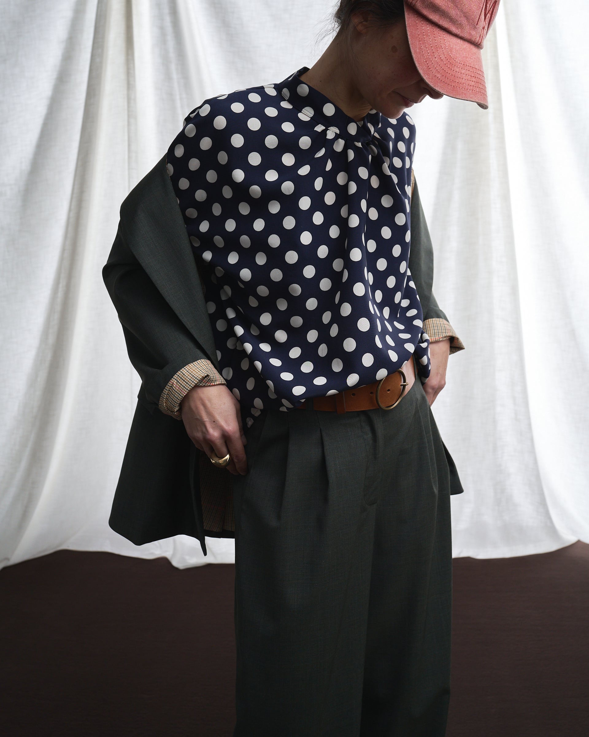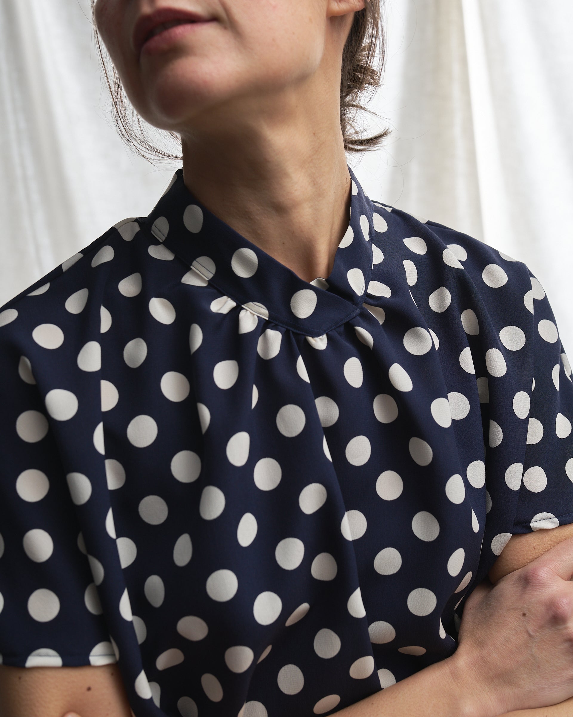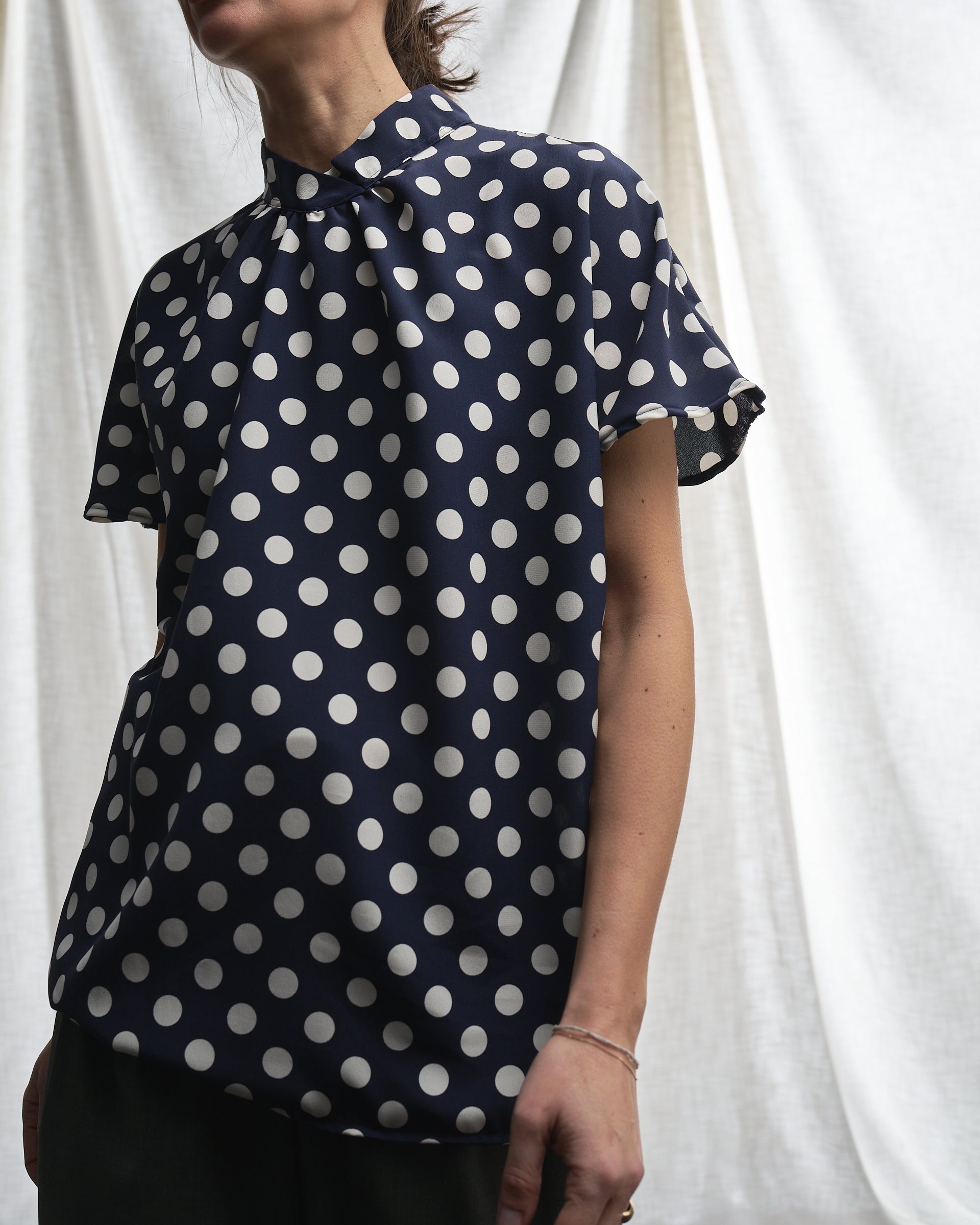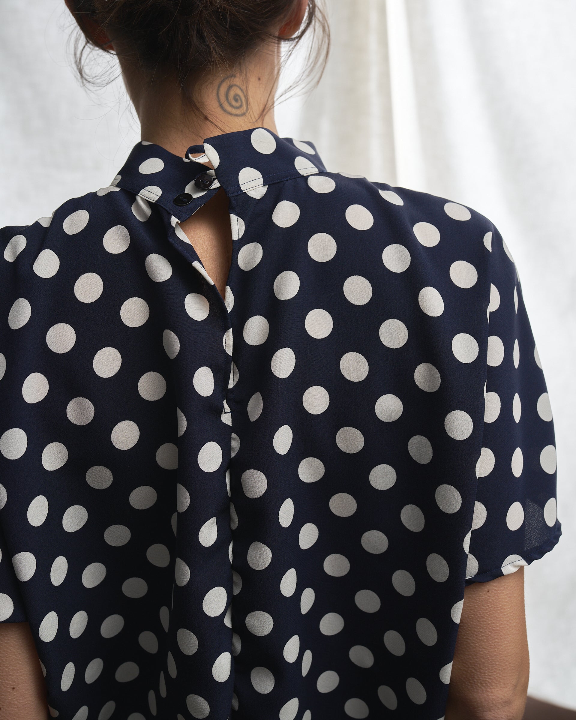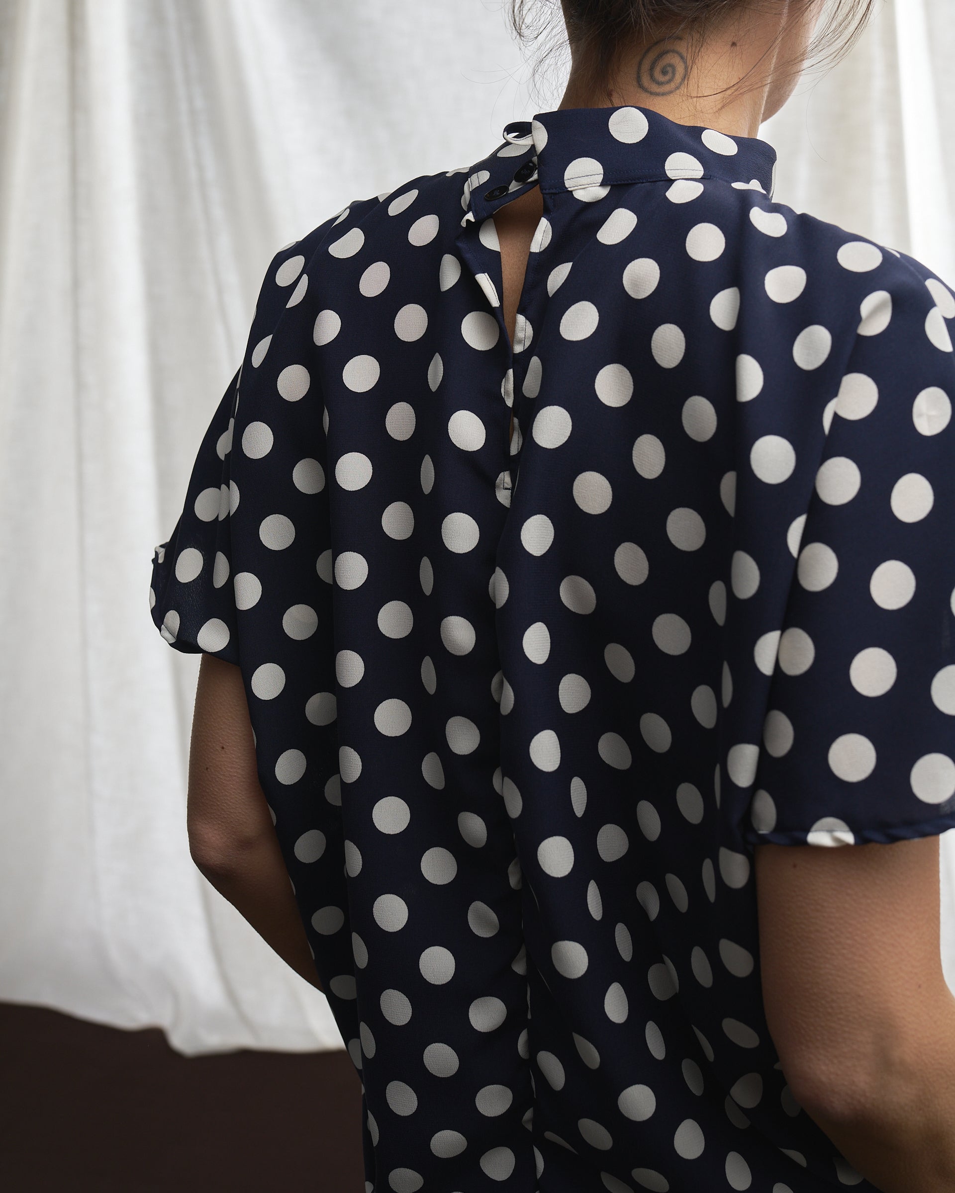 Top over con allacciatura sul collo, con bottoni in madreperla, apertura a goccia sulla schiena e colletto alla coreana, svasato e impreziosito da una leggera arricciatura, tutti dettagli che rendono questo top kimono a mezza manica versatile e pratico, oltre che elegante e femminile.