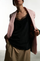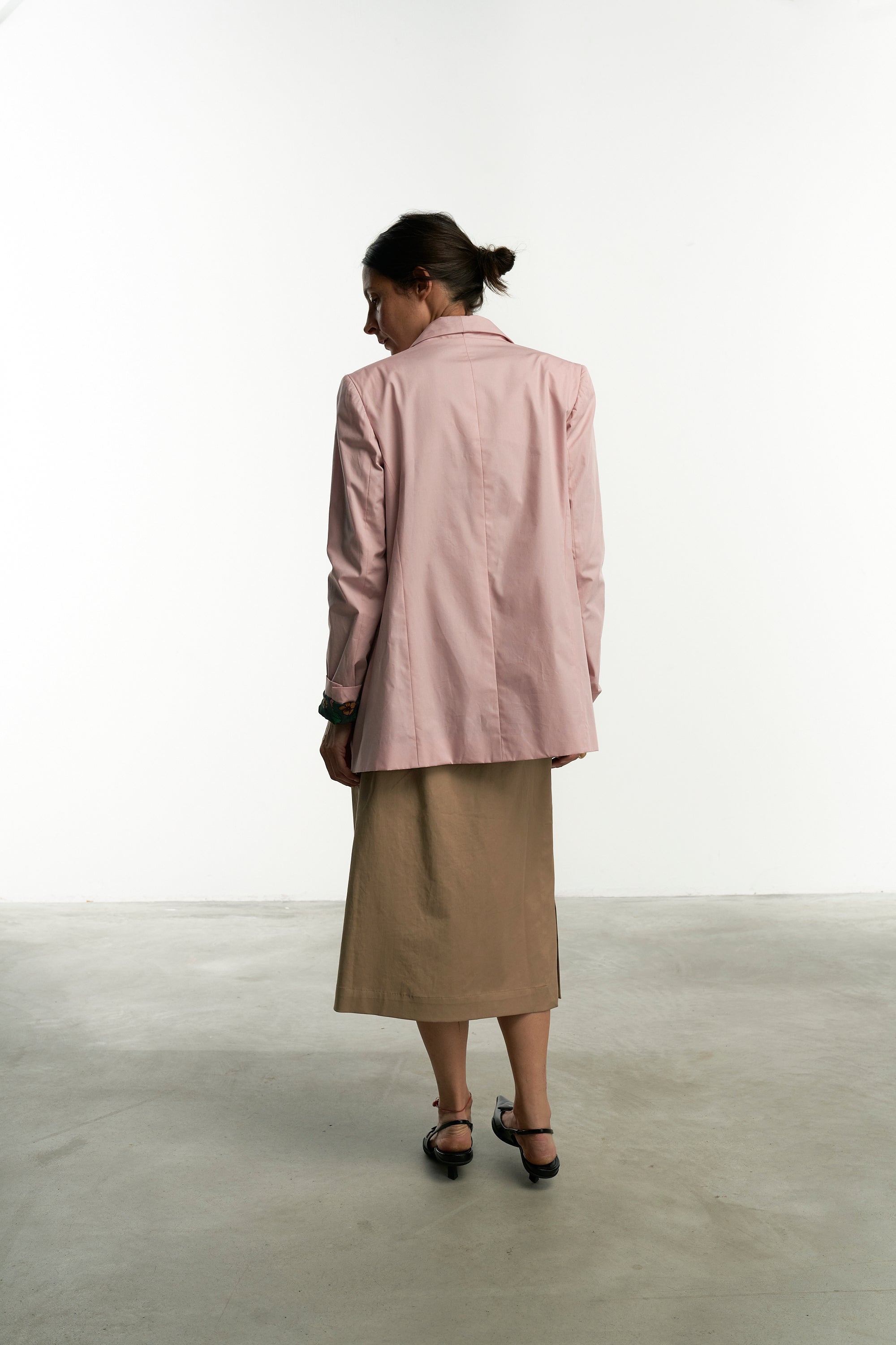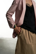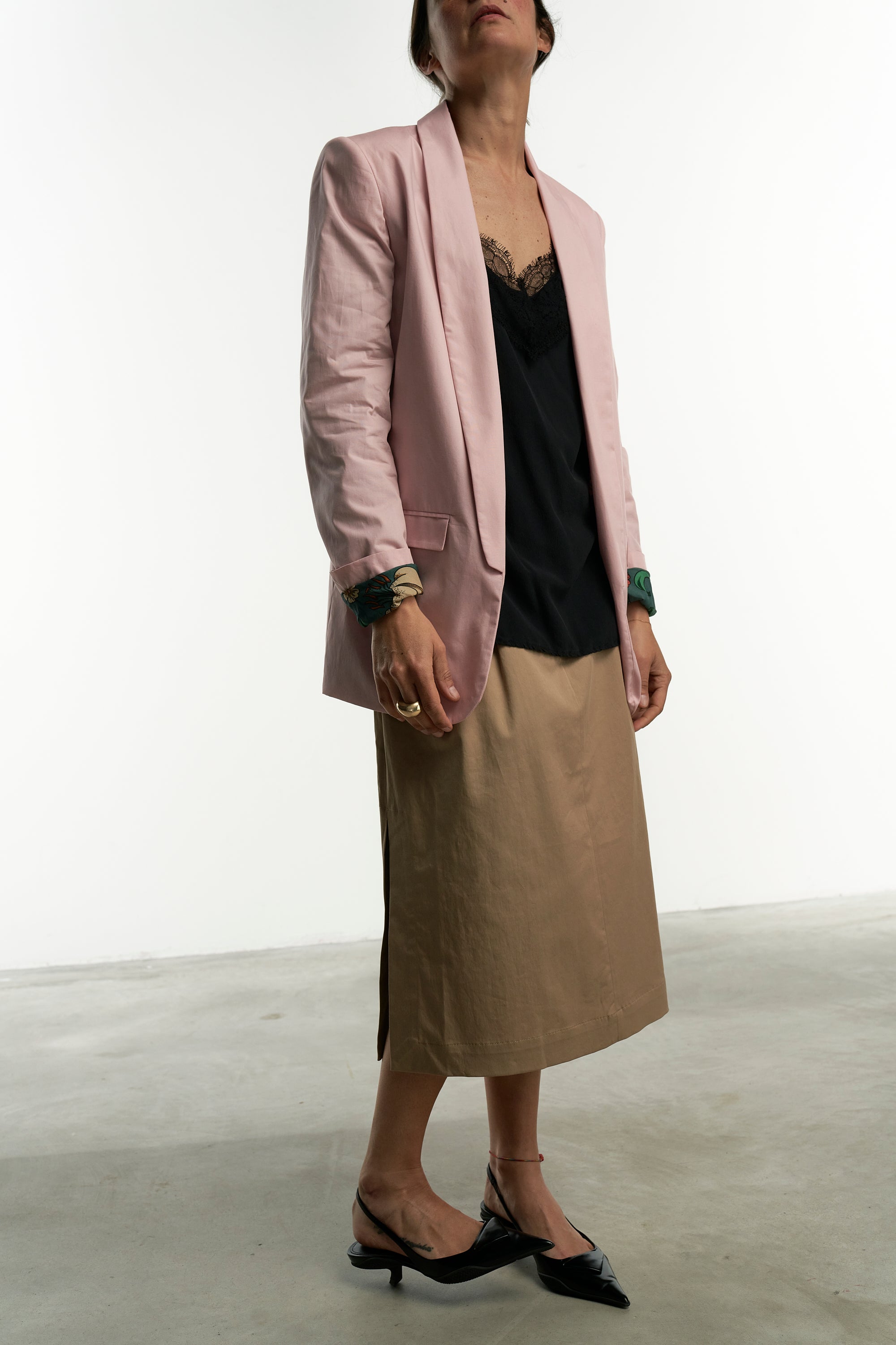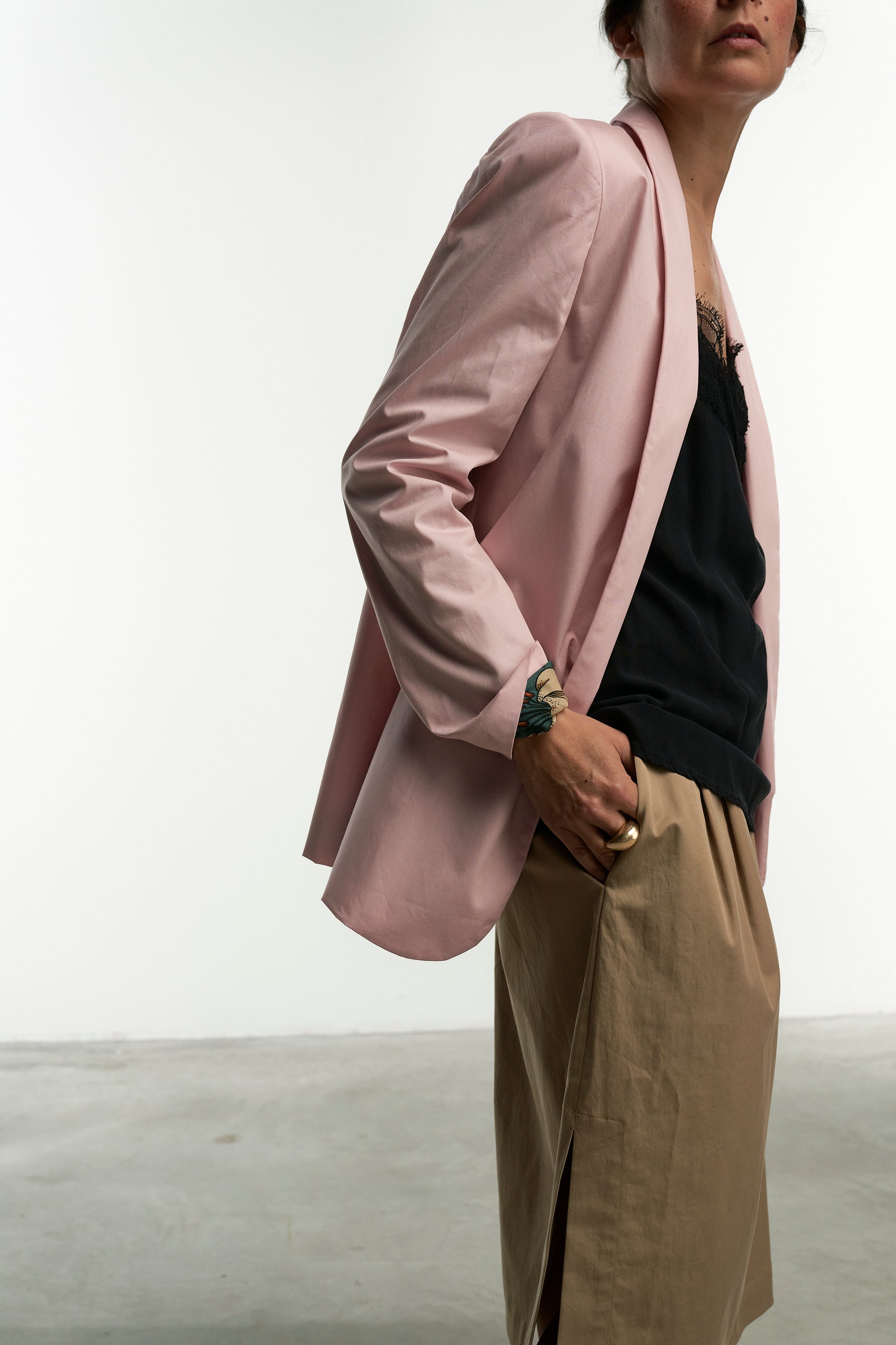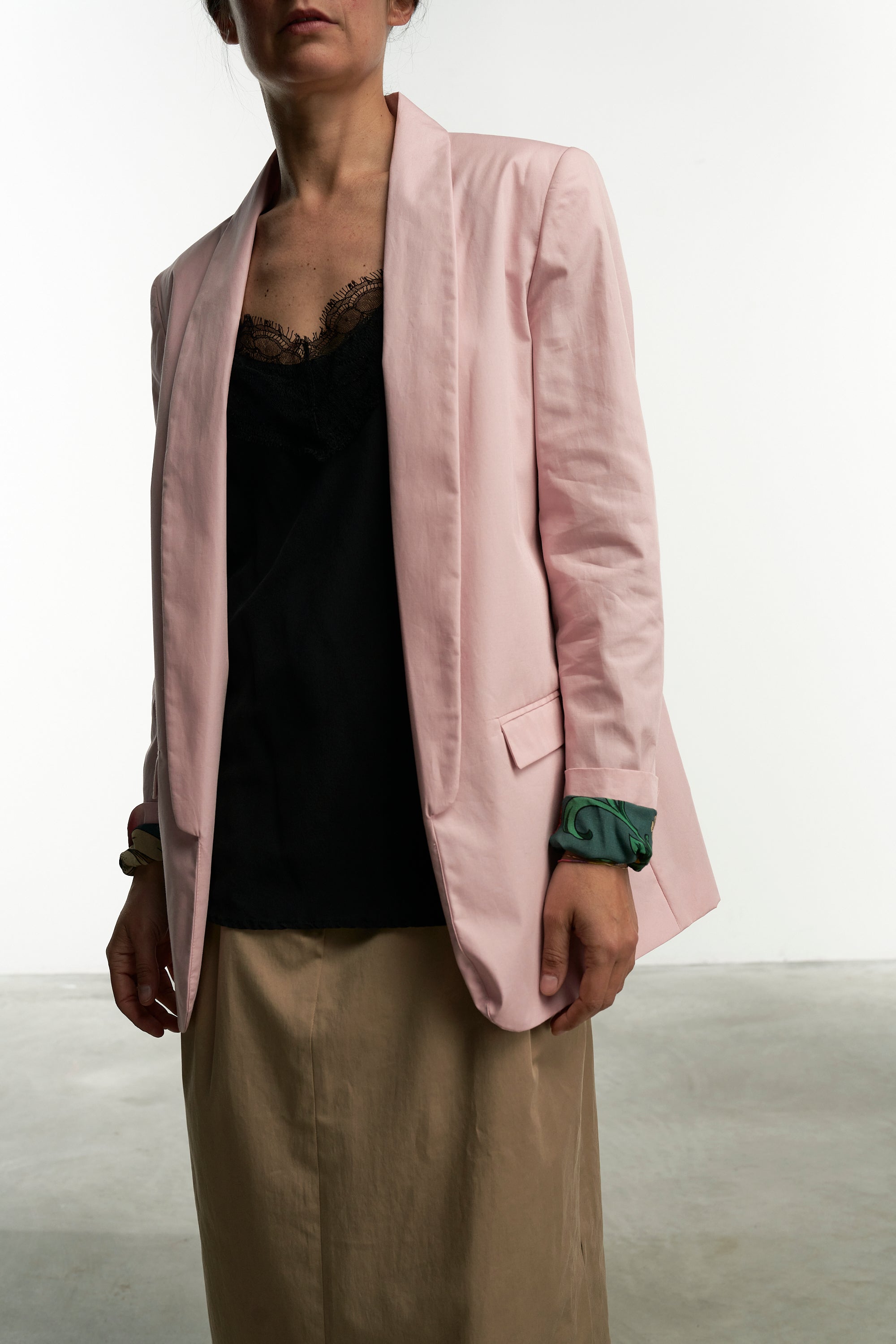 Un blazer monopetto, ispirato allo smoking maschile, con collo a scialle, dalle lance profonde e senza bottone.