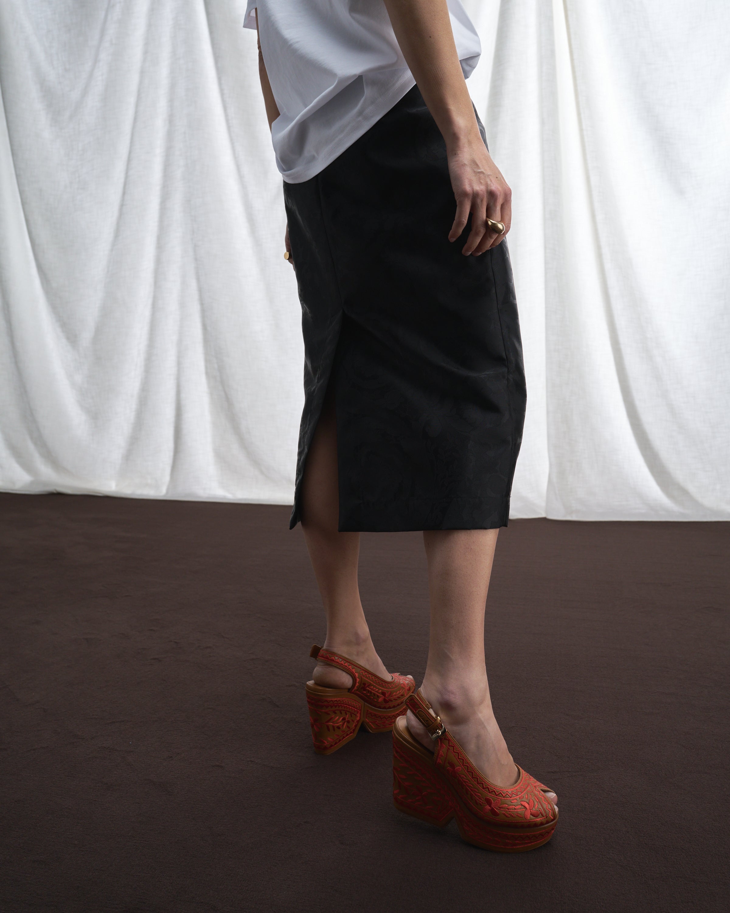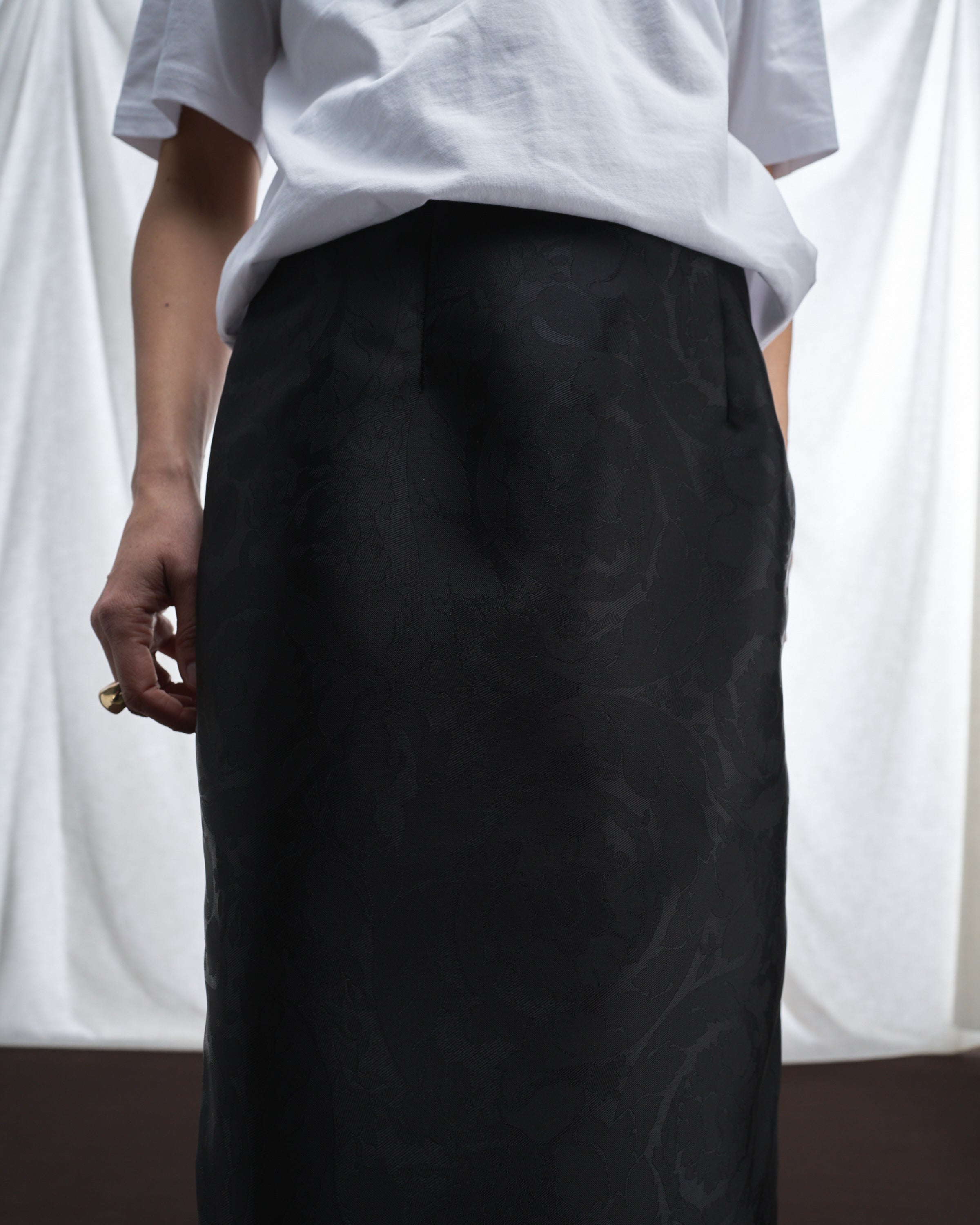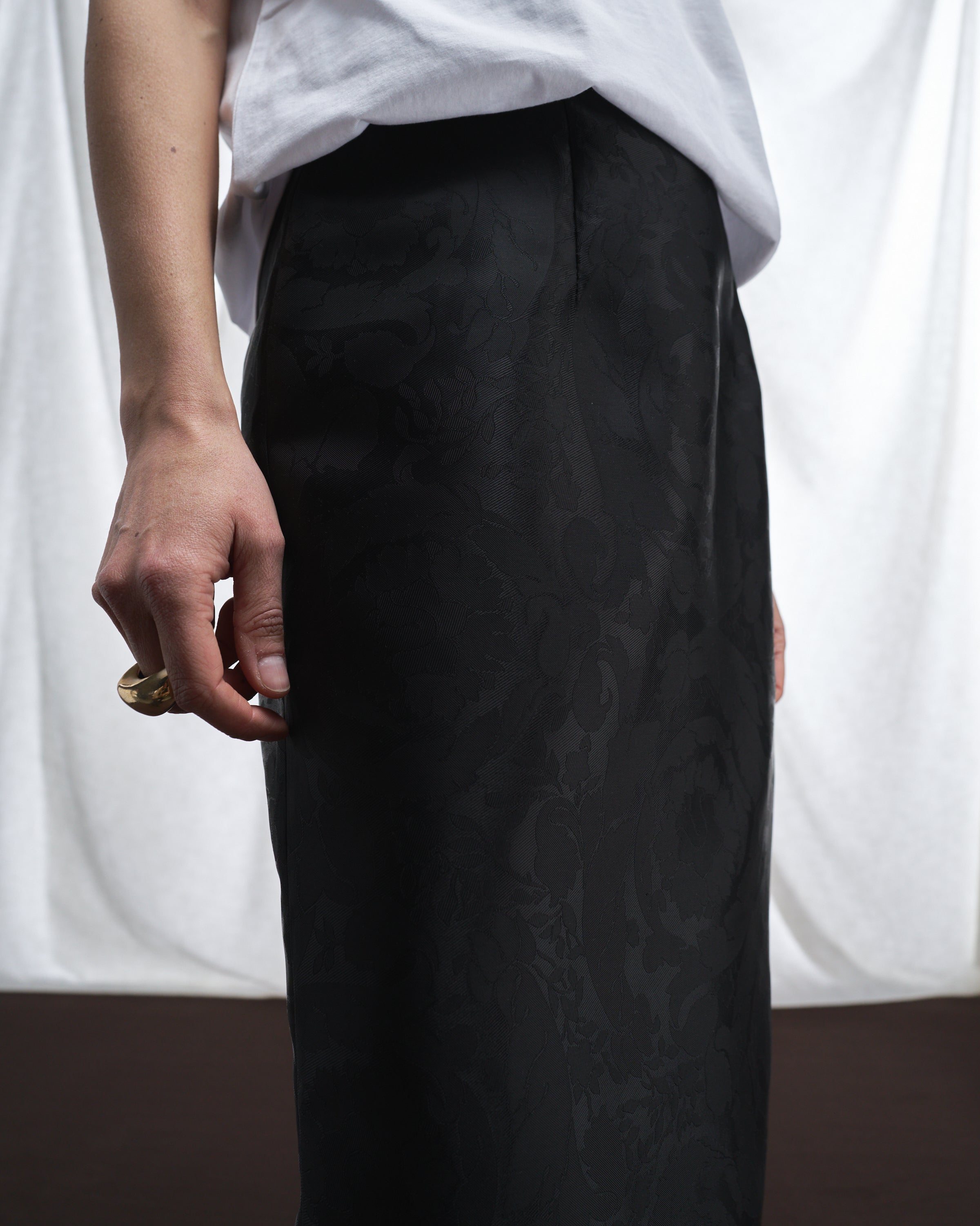 La gonna Anita è una classica gonna a matita, rigorosa nella linea e realizzata con un tessuto prezioso: damascato nero su nero.
