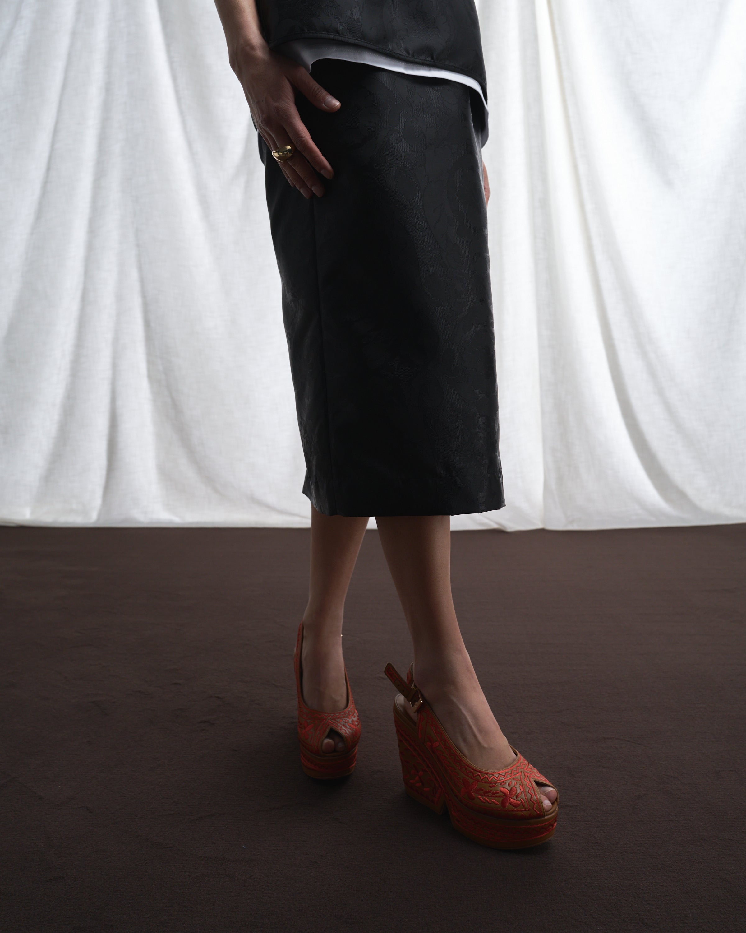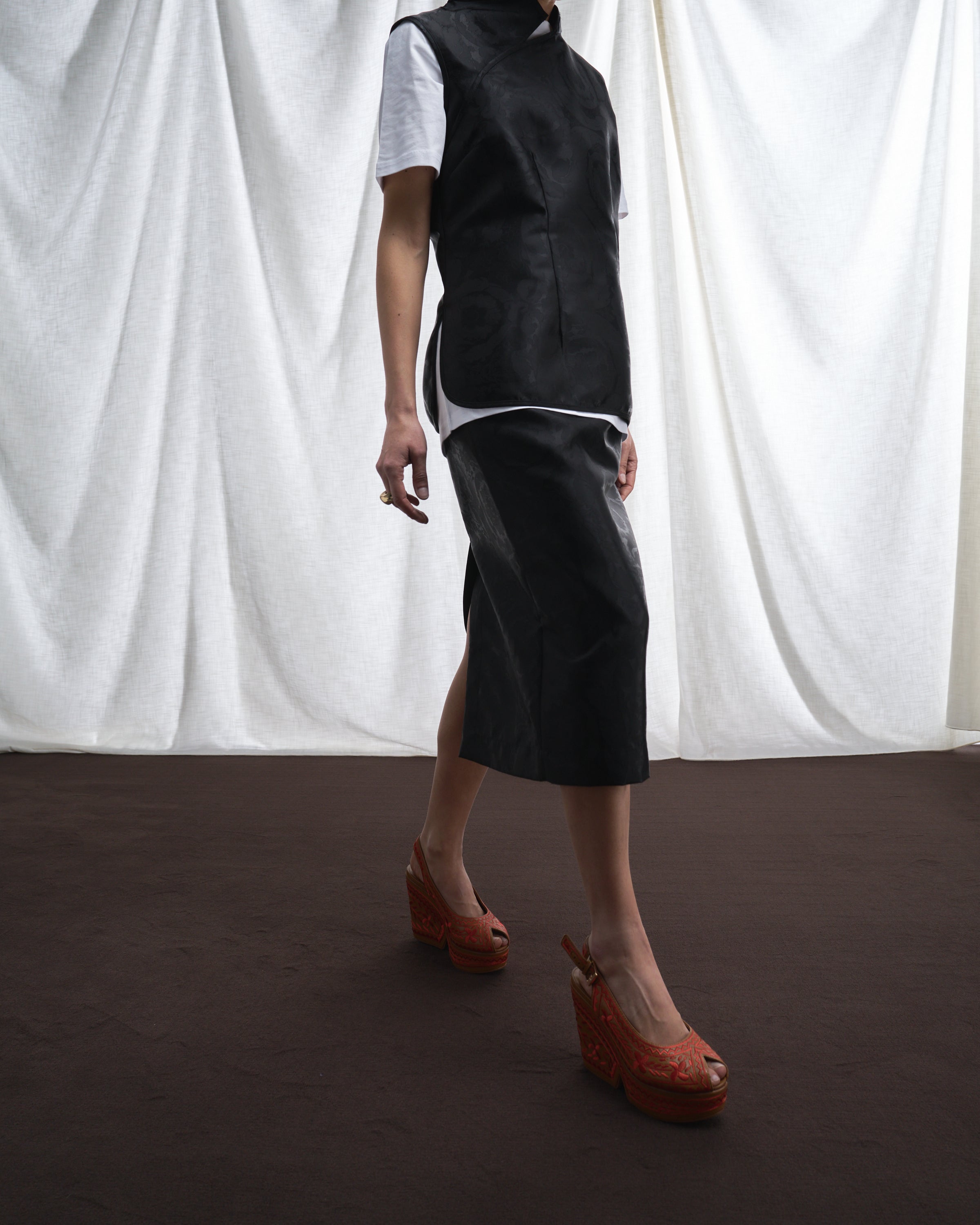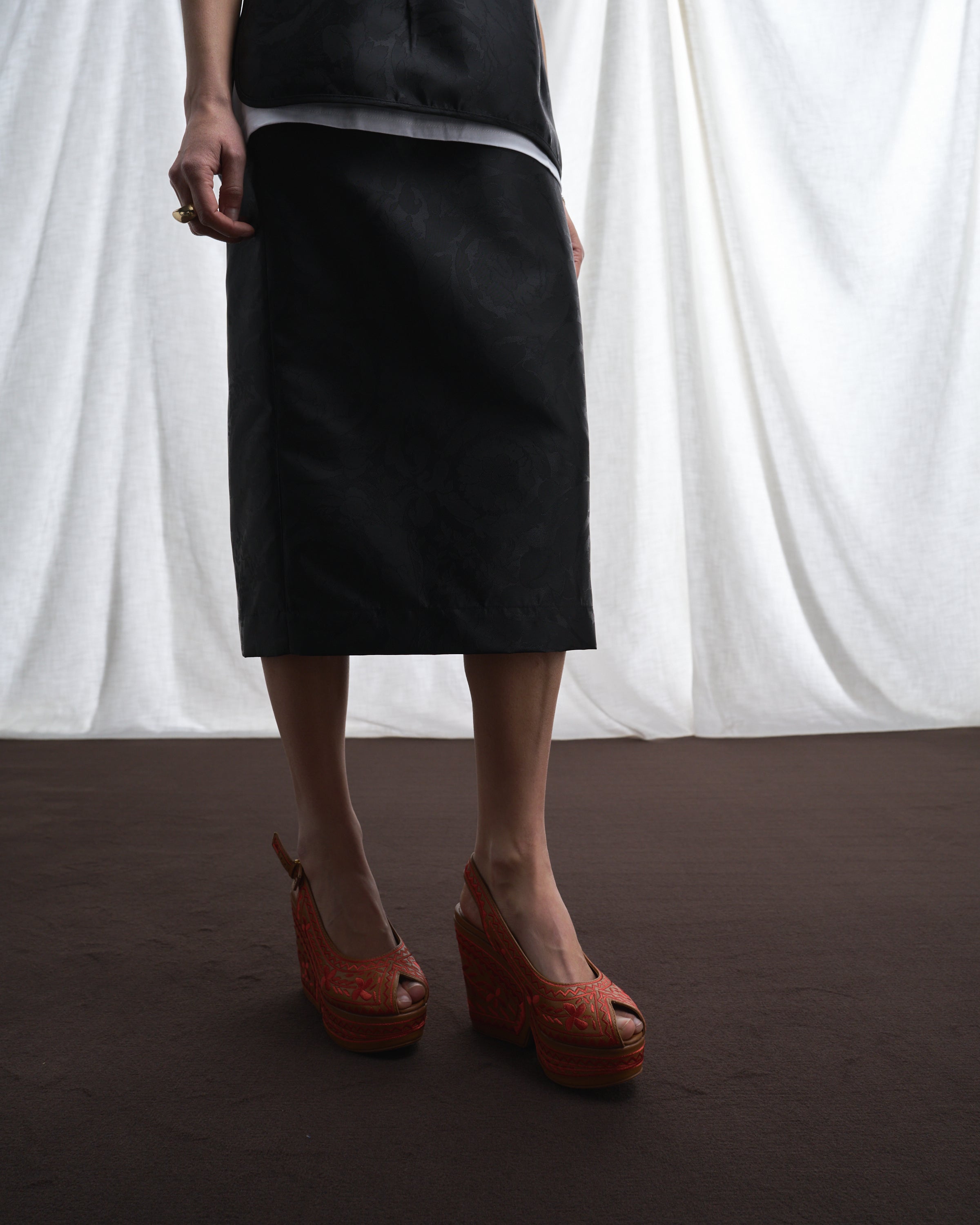 La gonna Anita è una classica gonna a matita, rigorosa nella linea e realizzata con un tessuto prezioso: damascato nero su nero.