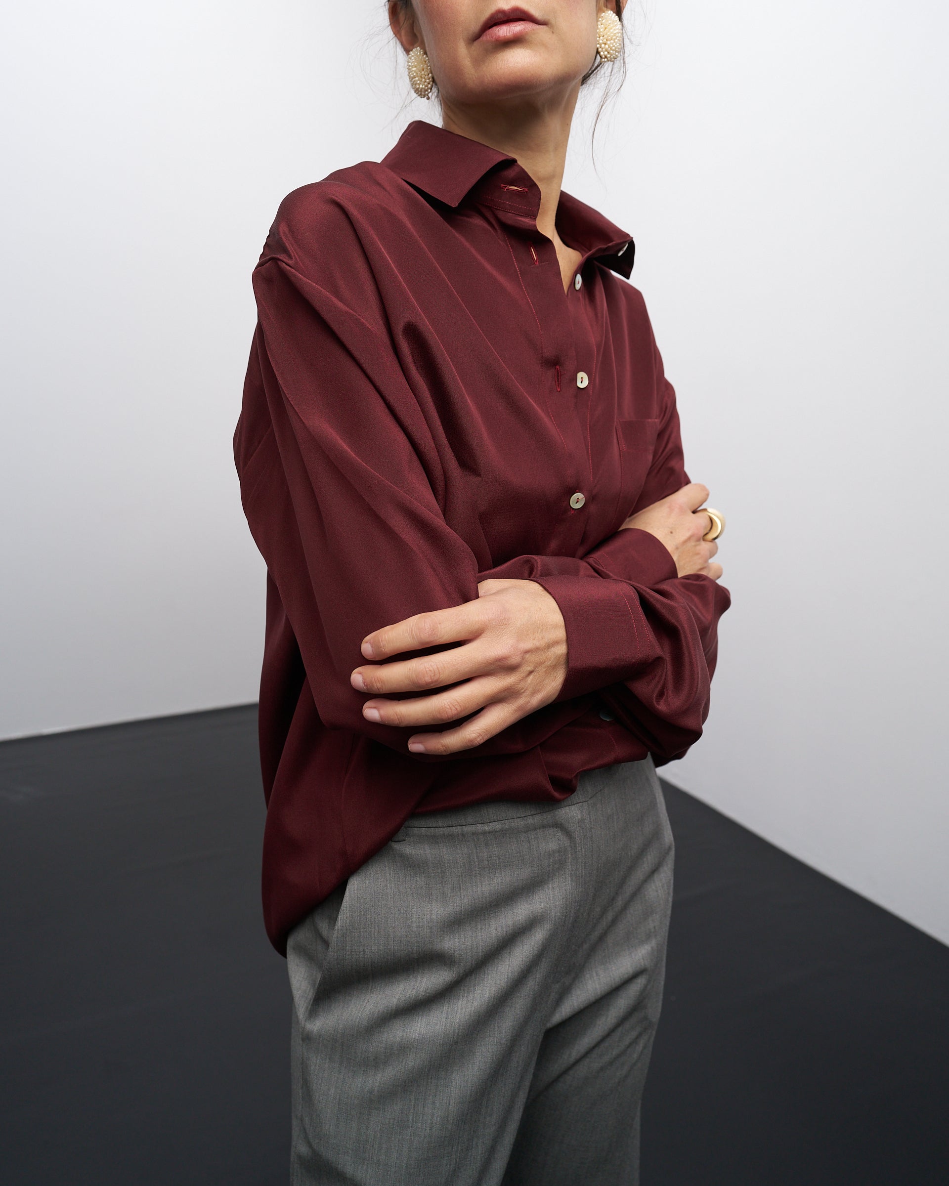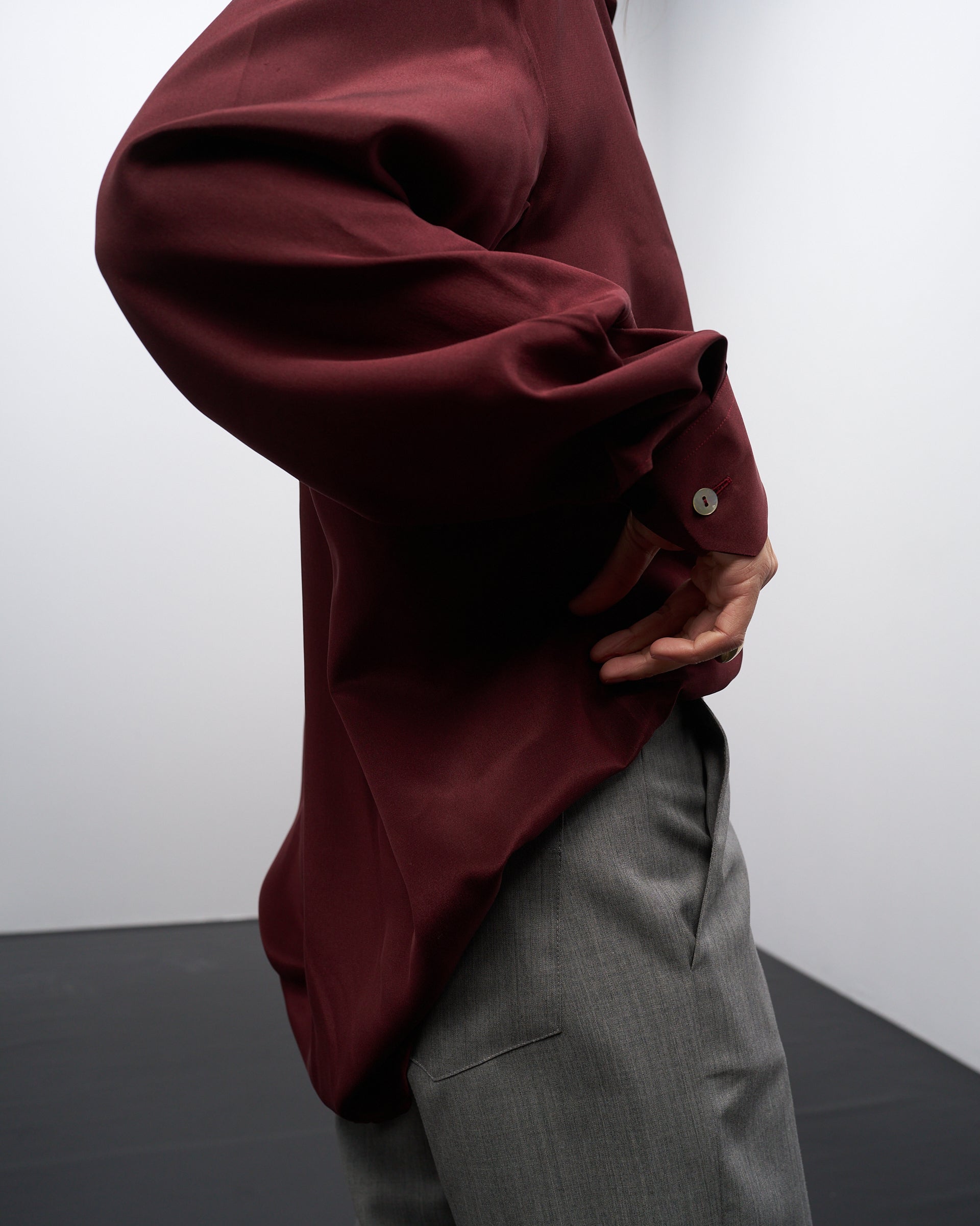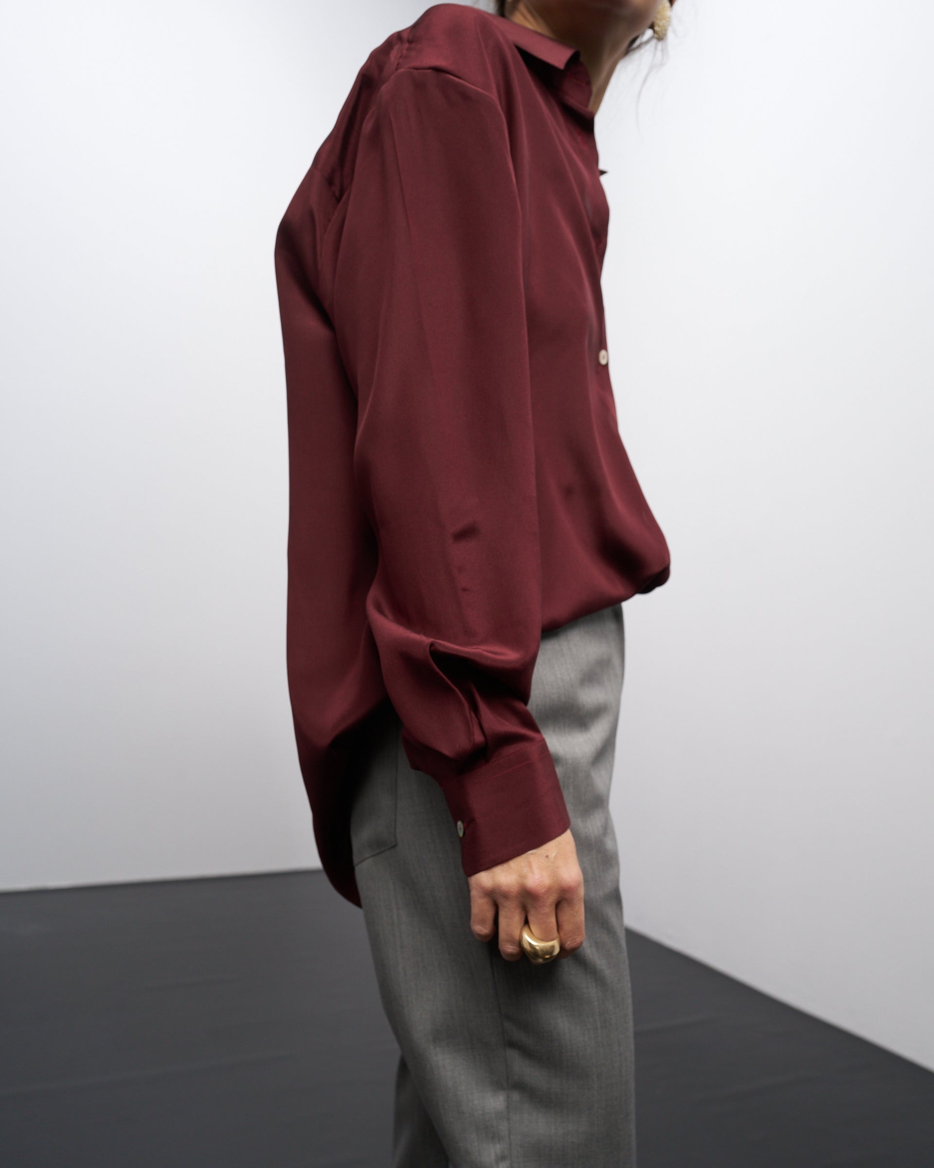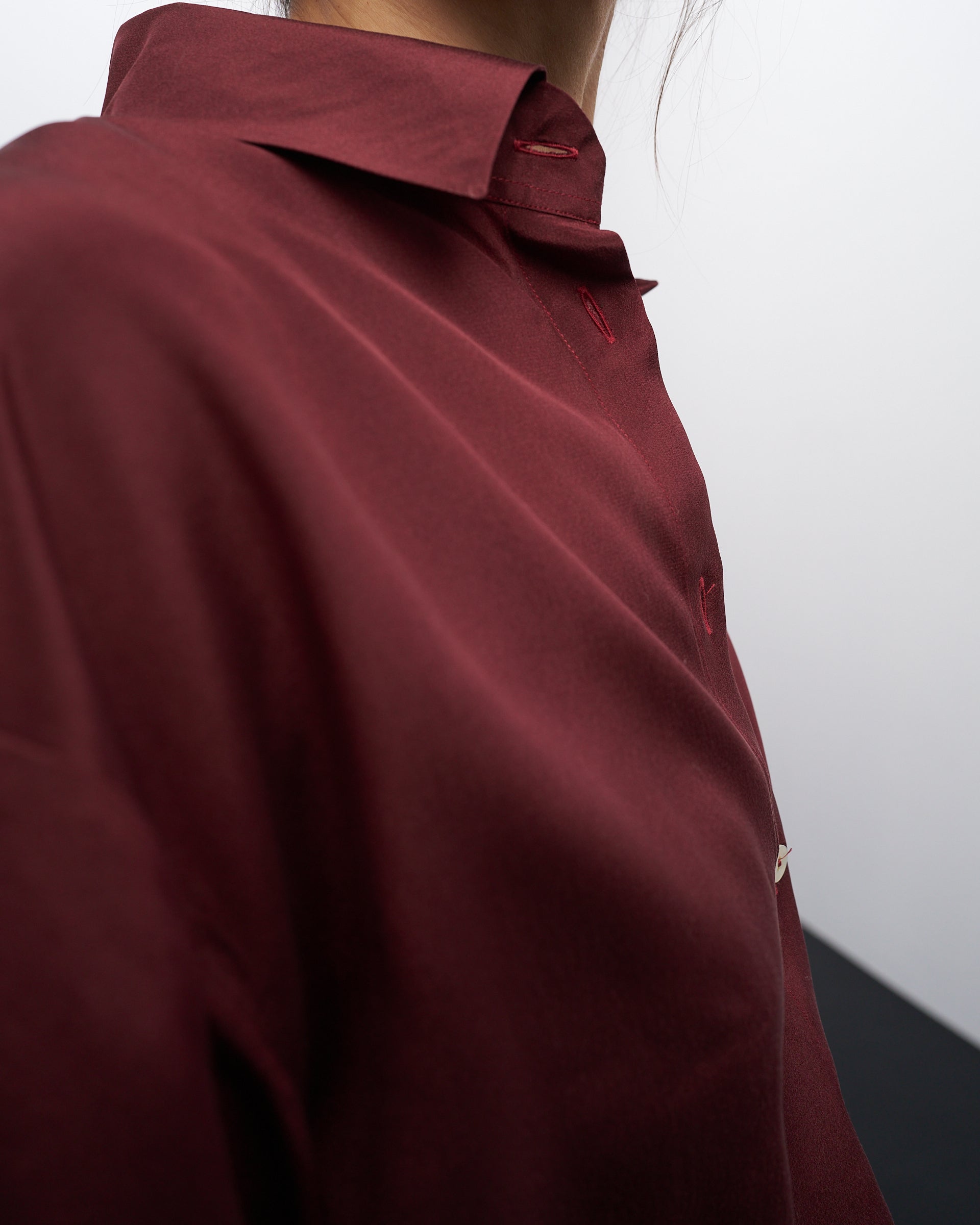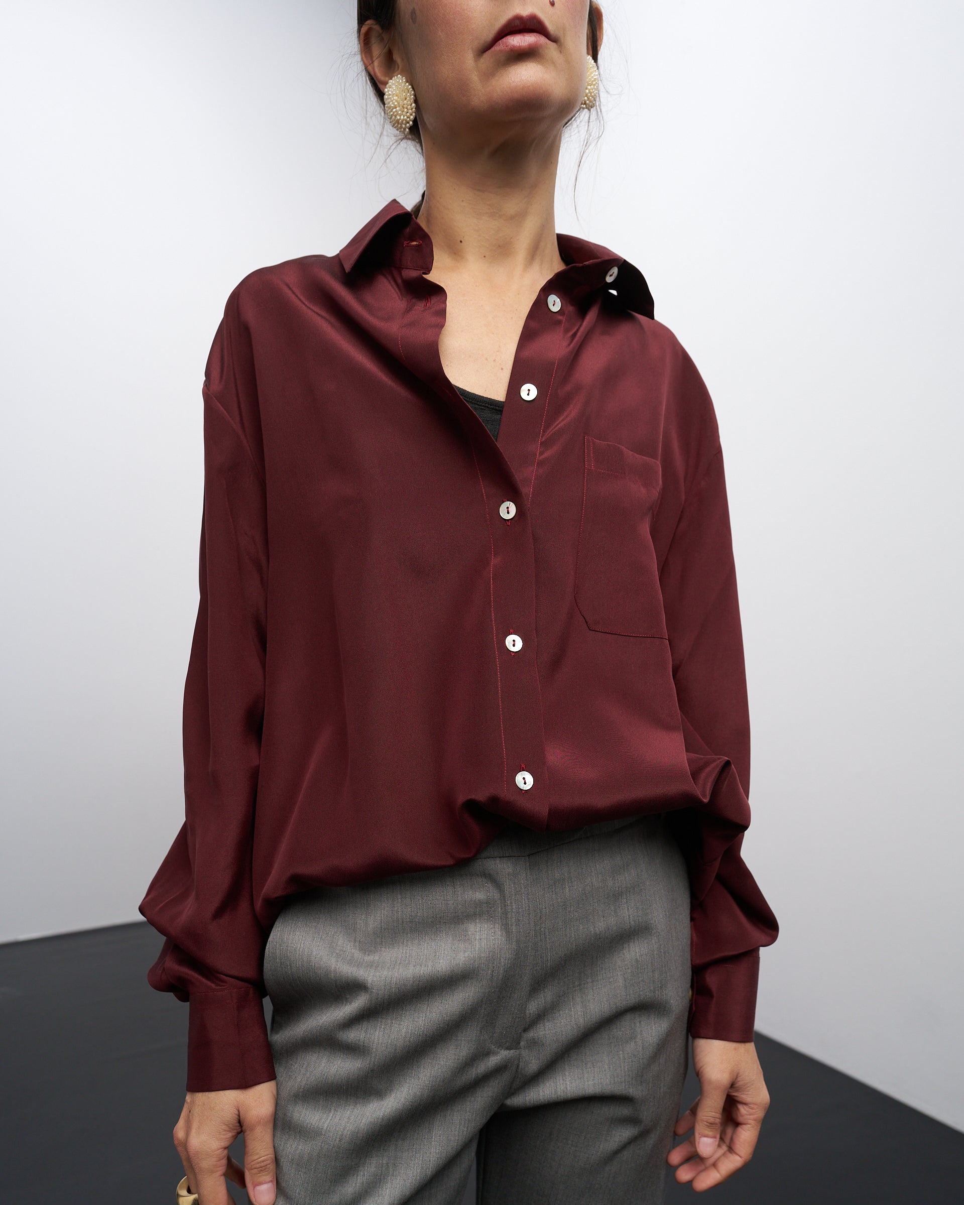 Una camicia classica e indispensabile, in una elegante seta bordeaux, a maniche lunghe, con tasca applicata e sfondo piega sul retro.