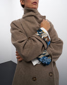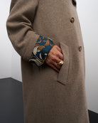 Realizzato in un bellissimo tessuto italiano in misto lana, in un pattern spigato sui toni del marrone, interamente foderato con una preziosa seta a fiori.