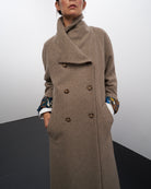 Il cappotto MARIO 25 è un cappotto lungo, doppiopetto, con un ampio bavero che diventa un collo avvolgente.