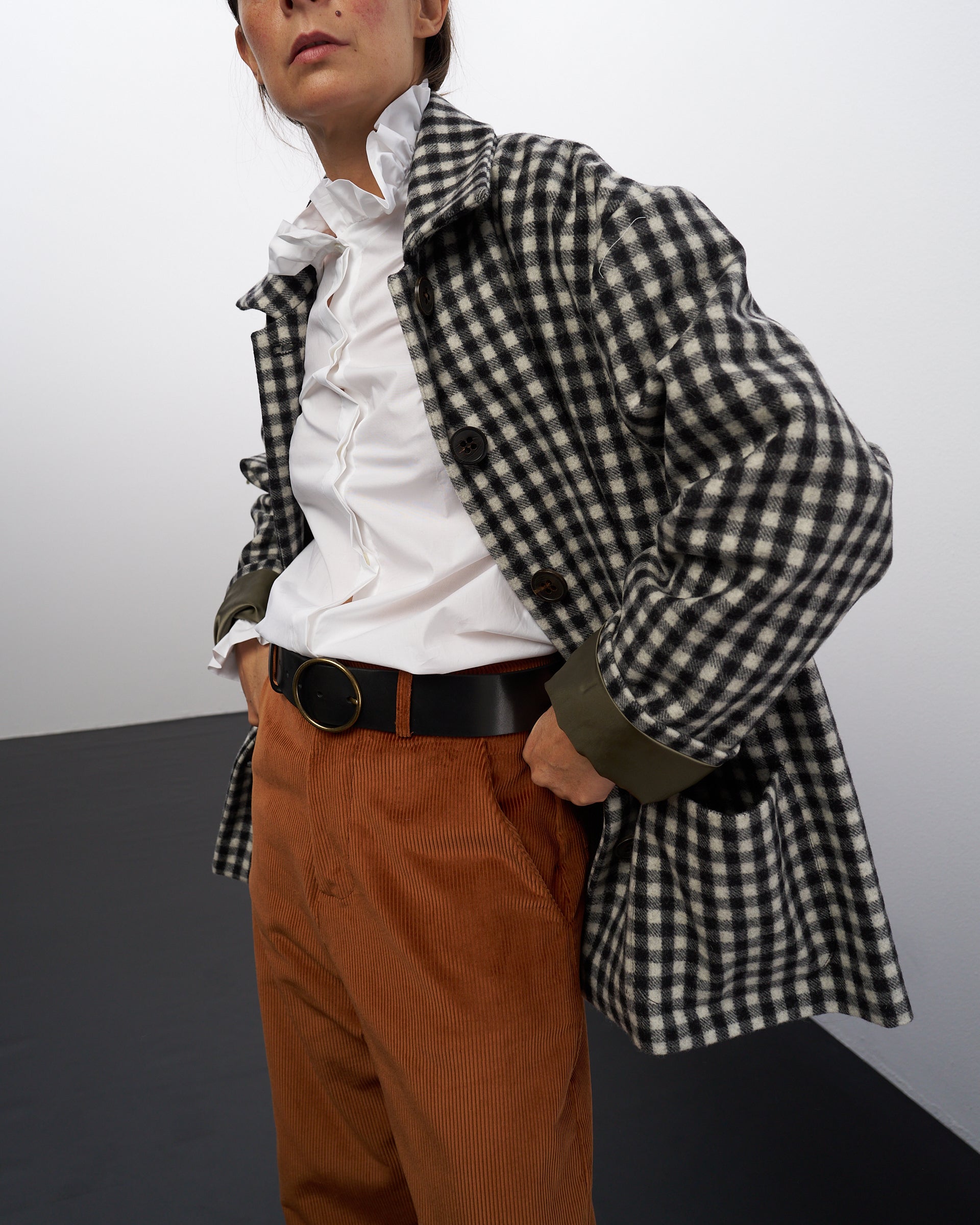 Silhouette ampia, spalle comode e una lunghezza appena sopra il bacino, che lascia liberi i fianchi per un capo dal fascino intramontabile.