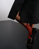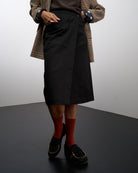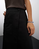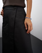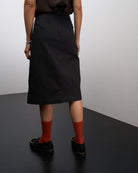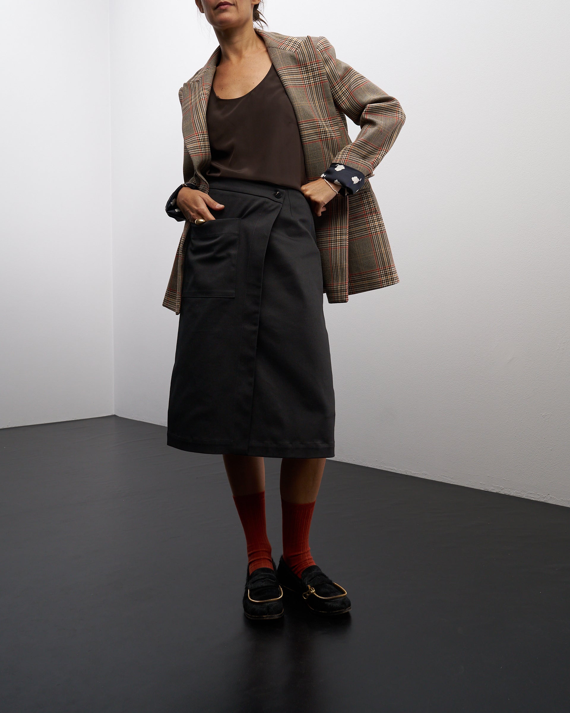 La gonna Nuccia, una longuette asimmetrica, realizzata con un pannello aperto sul davanti, ma cucito sul fianco, svasato e fermato da un bottone.