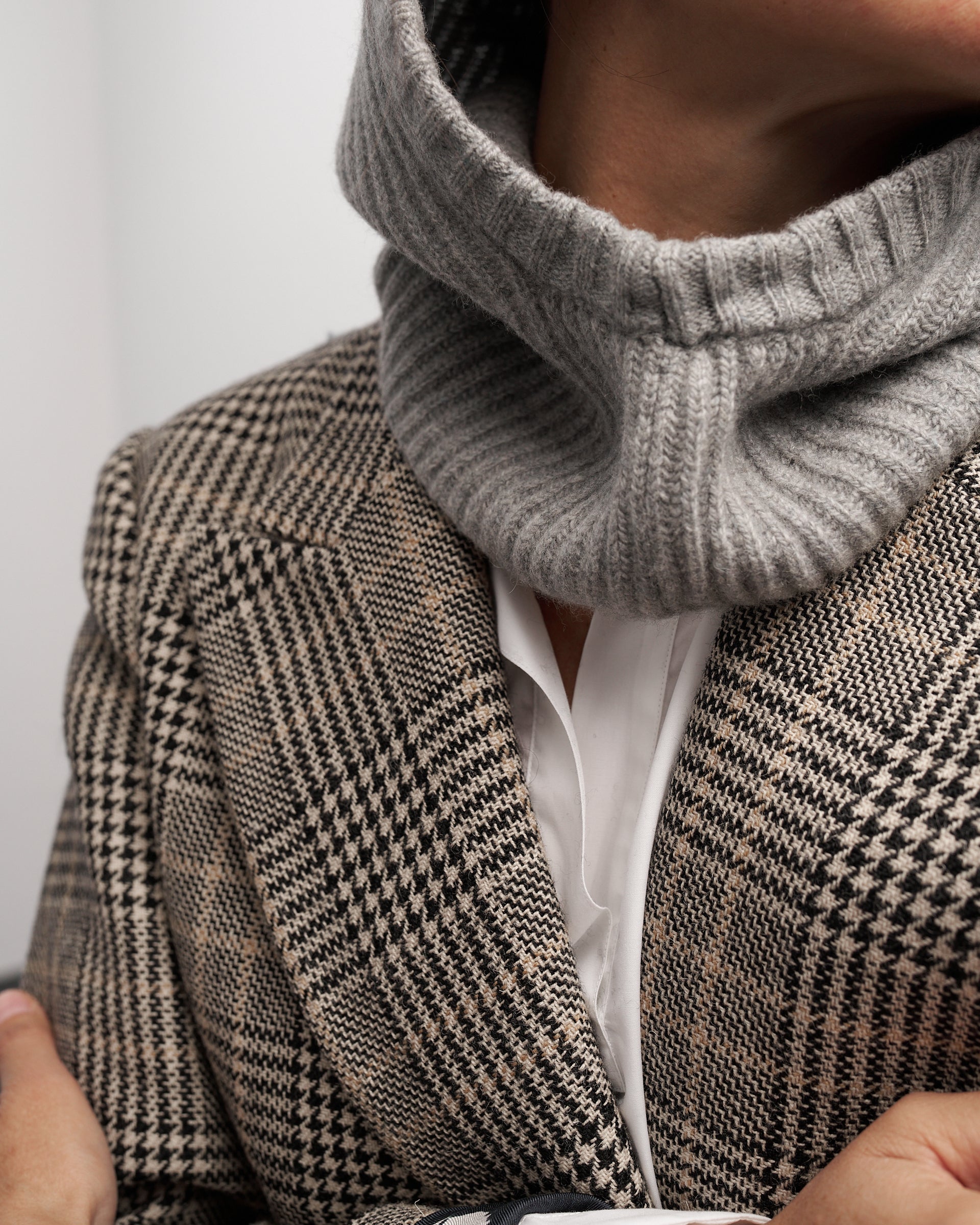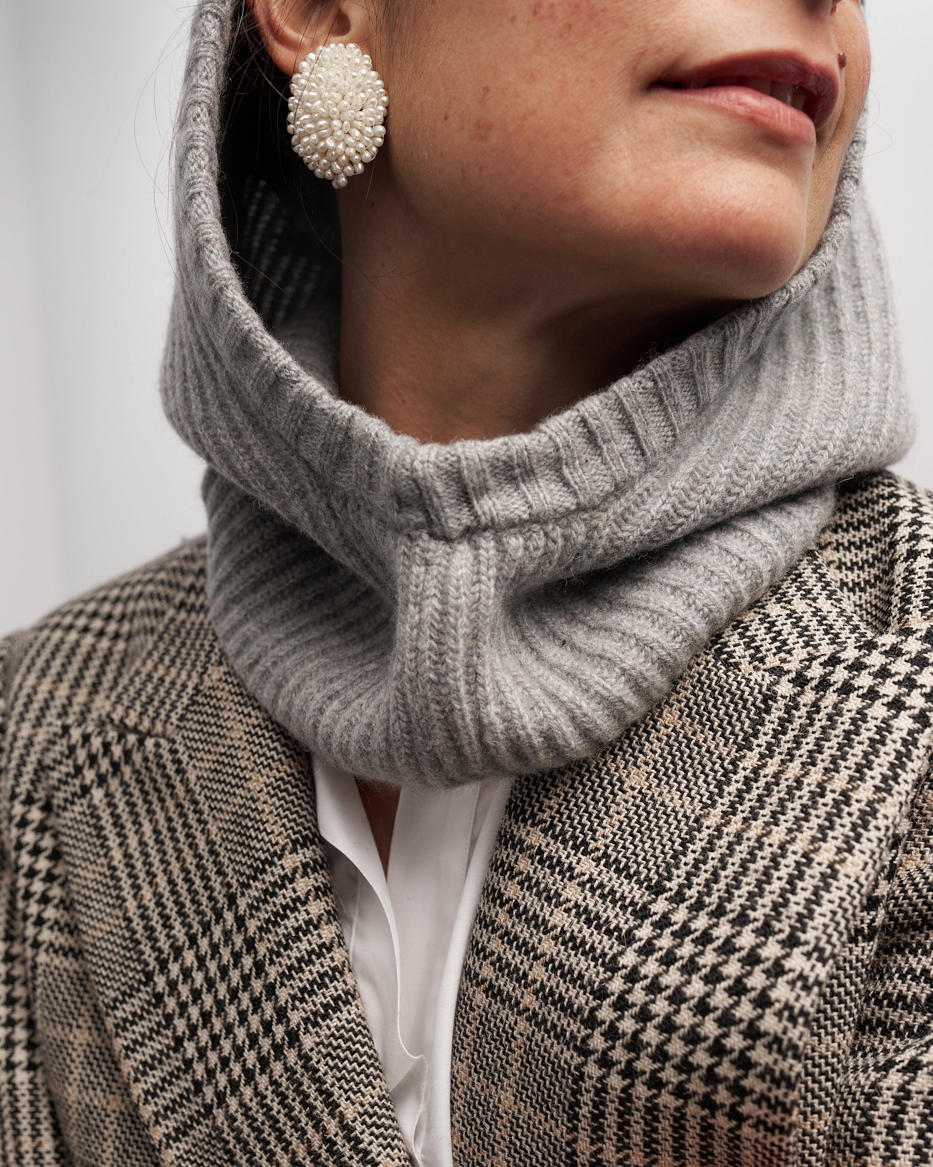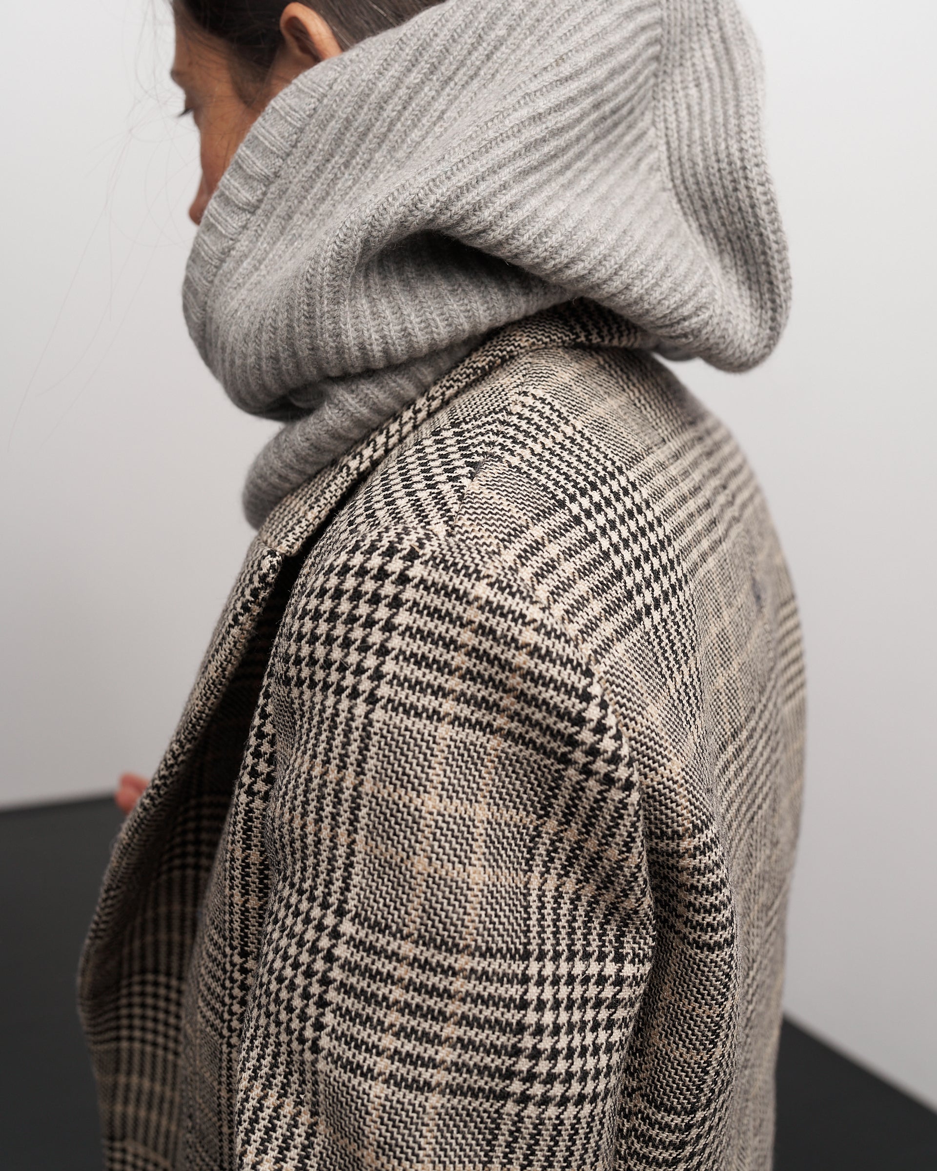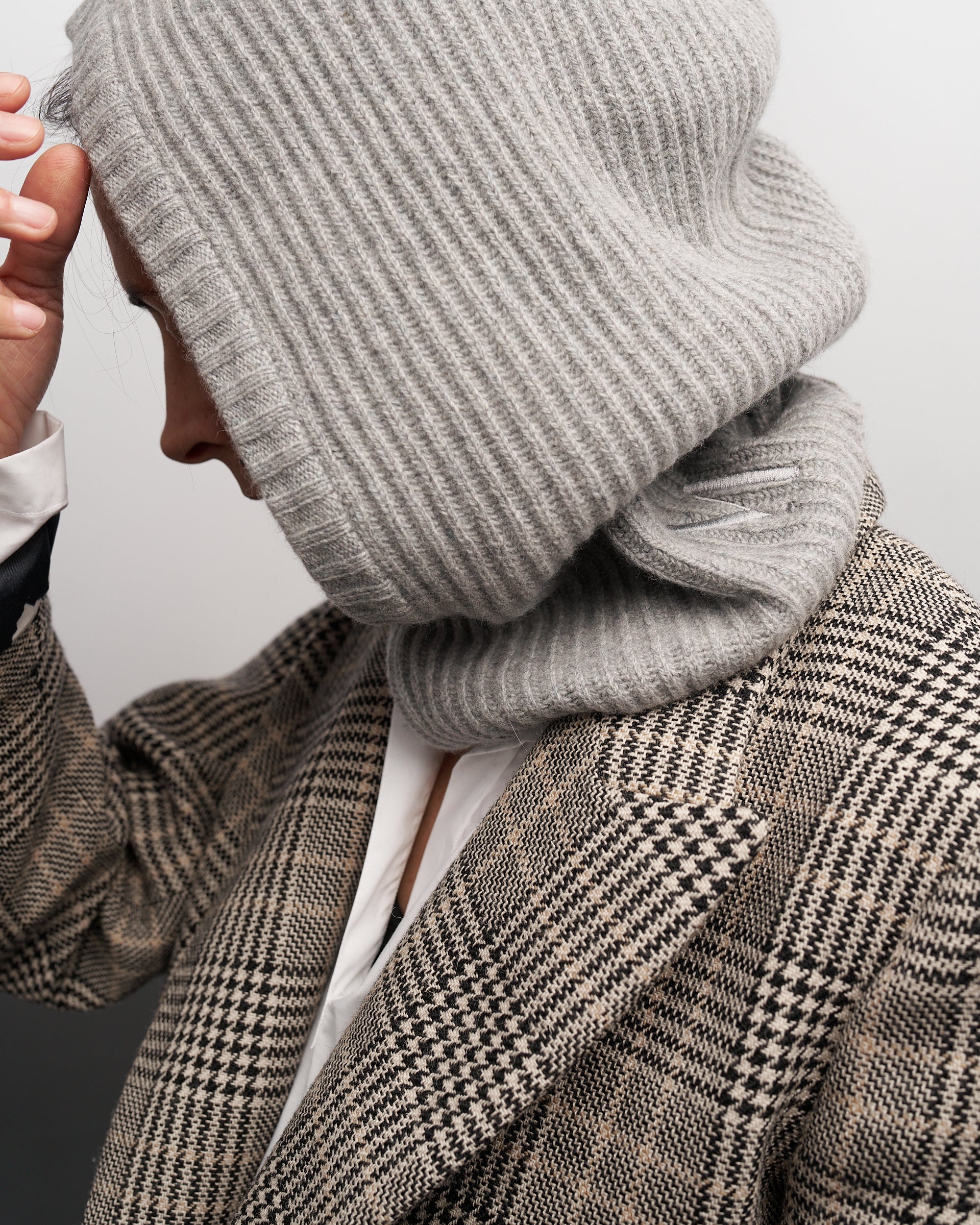 Il cappuccio unisex, realizzato in cachemire e lana rigenerati, è un accessorio sostenibile, originale e funzionale. Il design a tre pezzi rammagliati e il bordo in costa, lo rendono un capo caldo e confortevole, perfetto per le giornate più fredde.