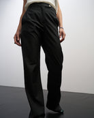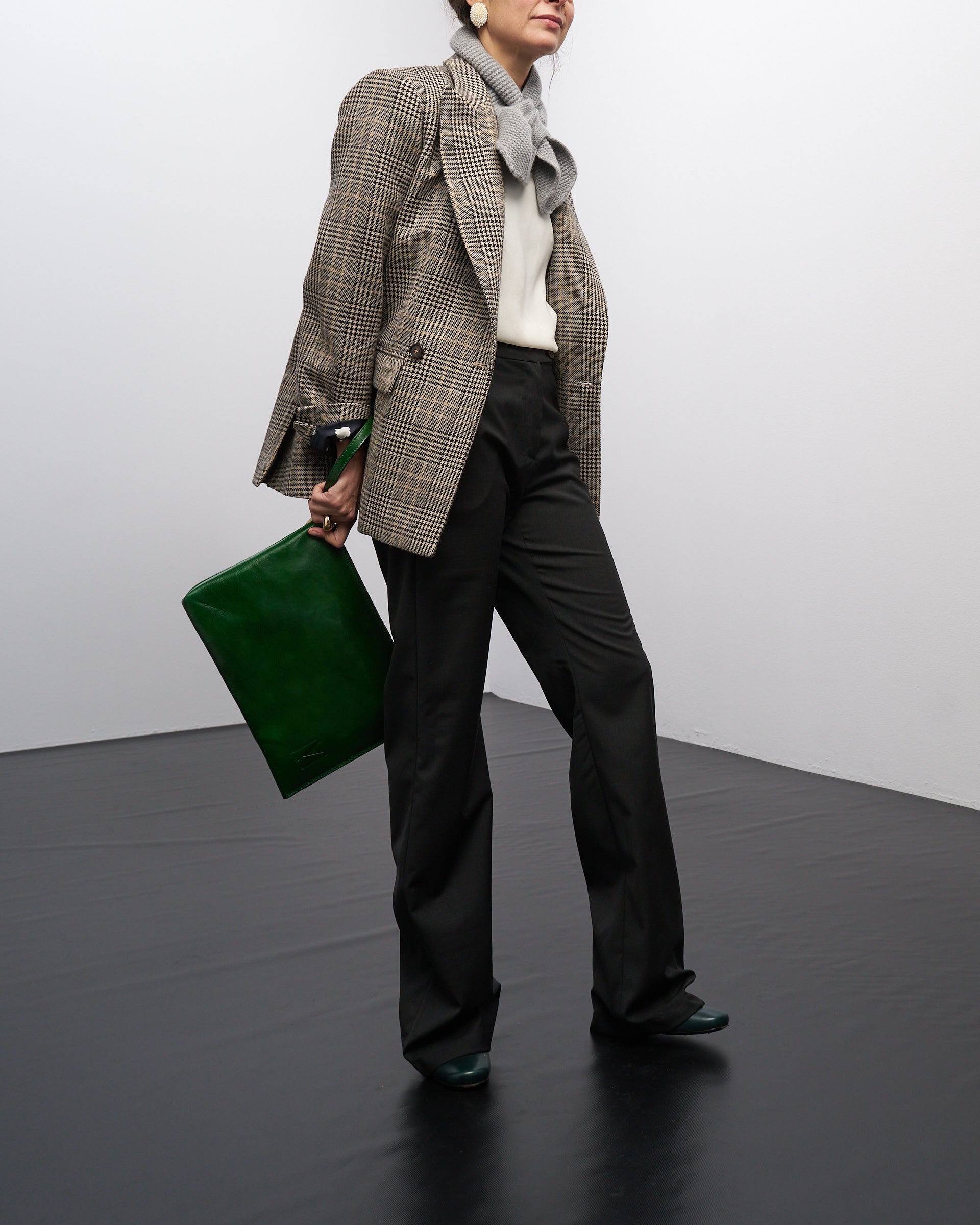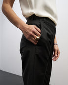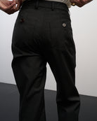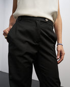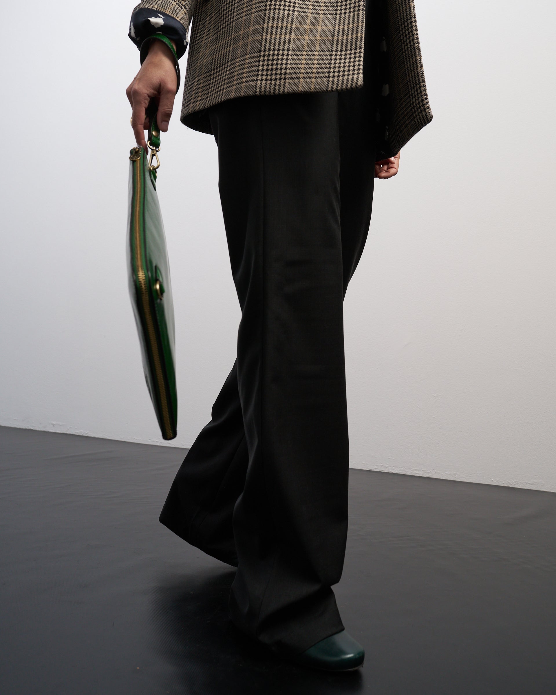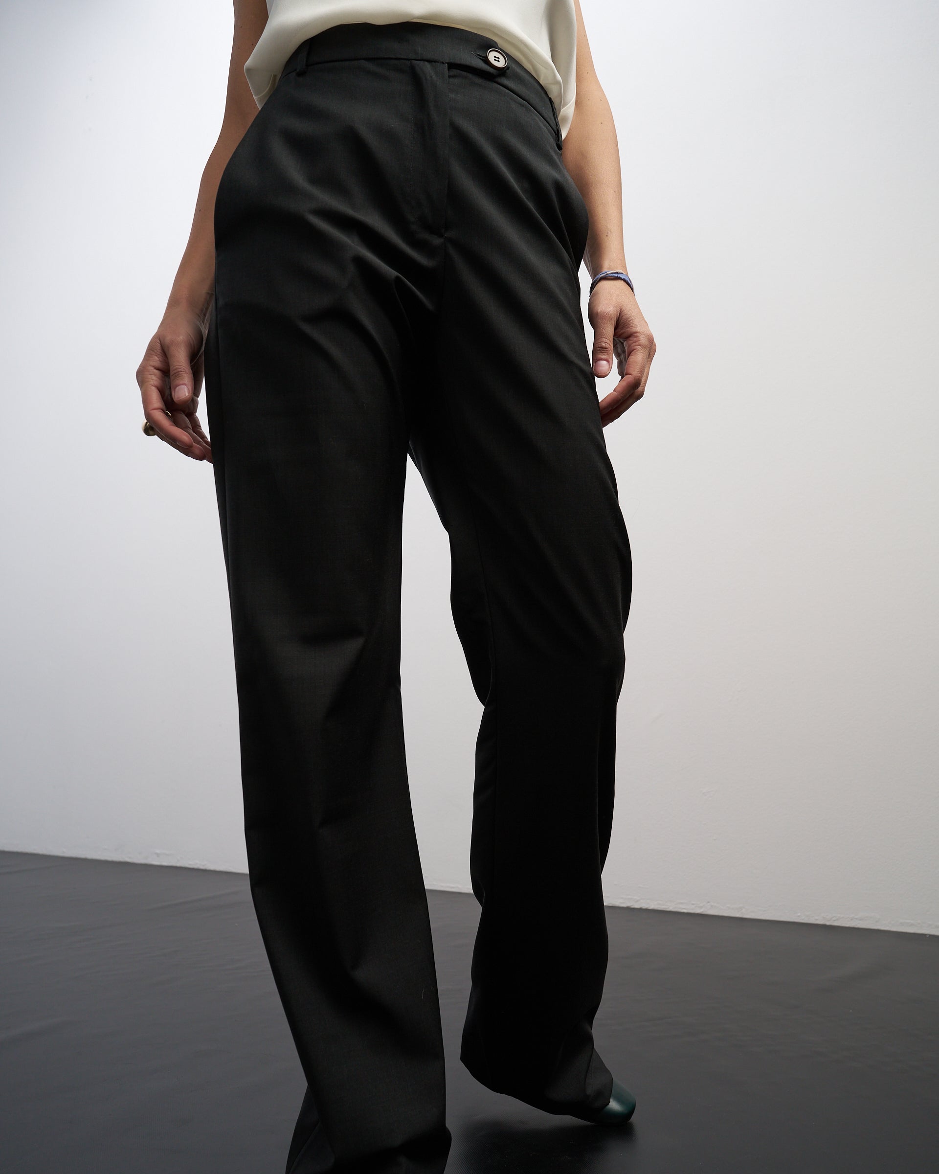 Un pantalone classico, con gamba dritta e ampia, tasche alla francese, vita media, cintura con passanti in vita e allacciatura con doppio bottone.