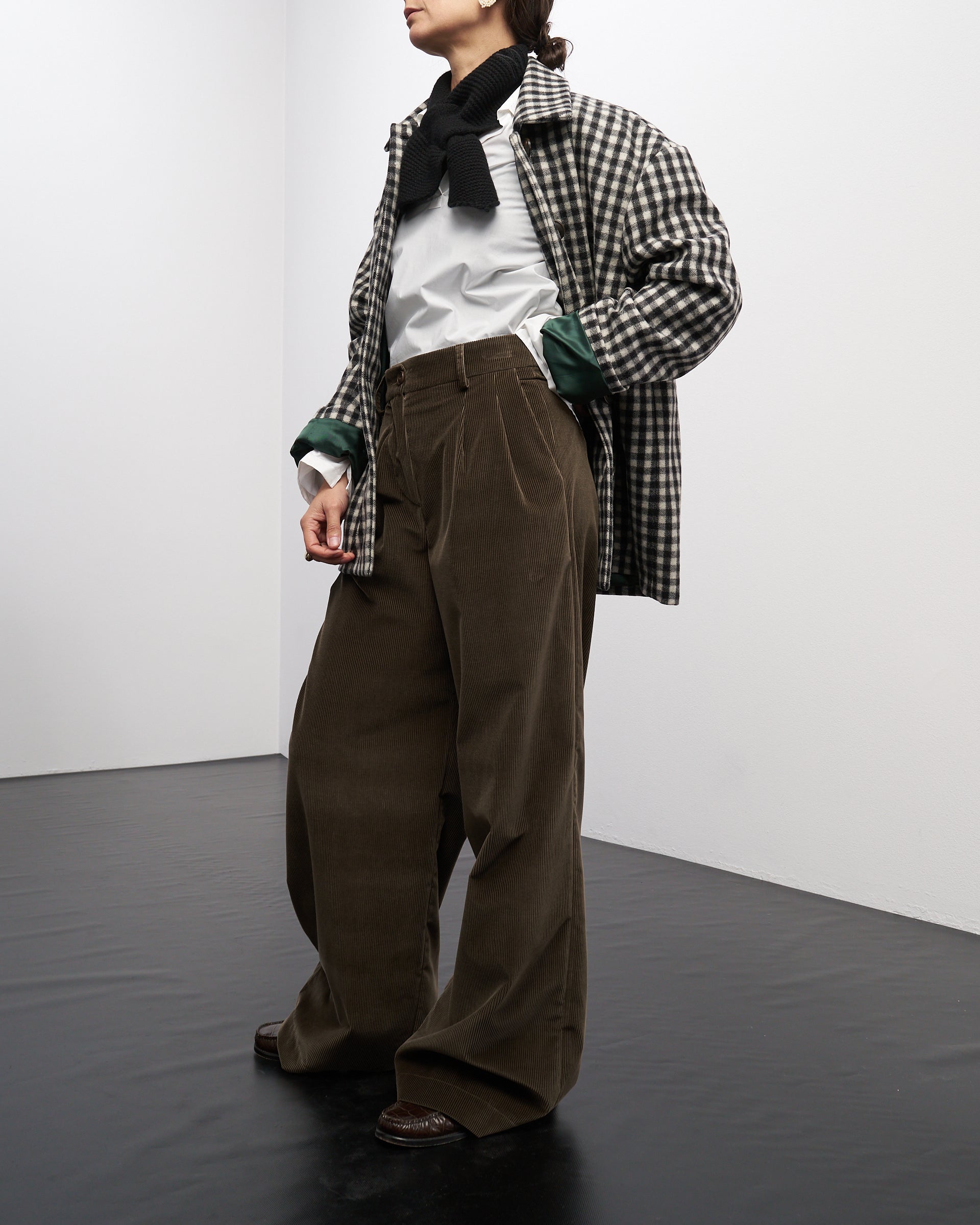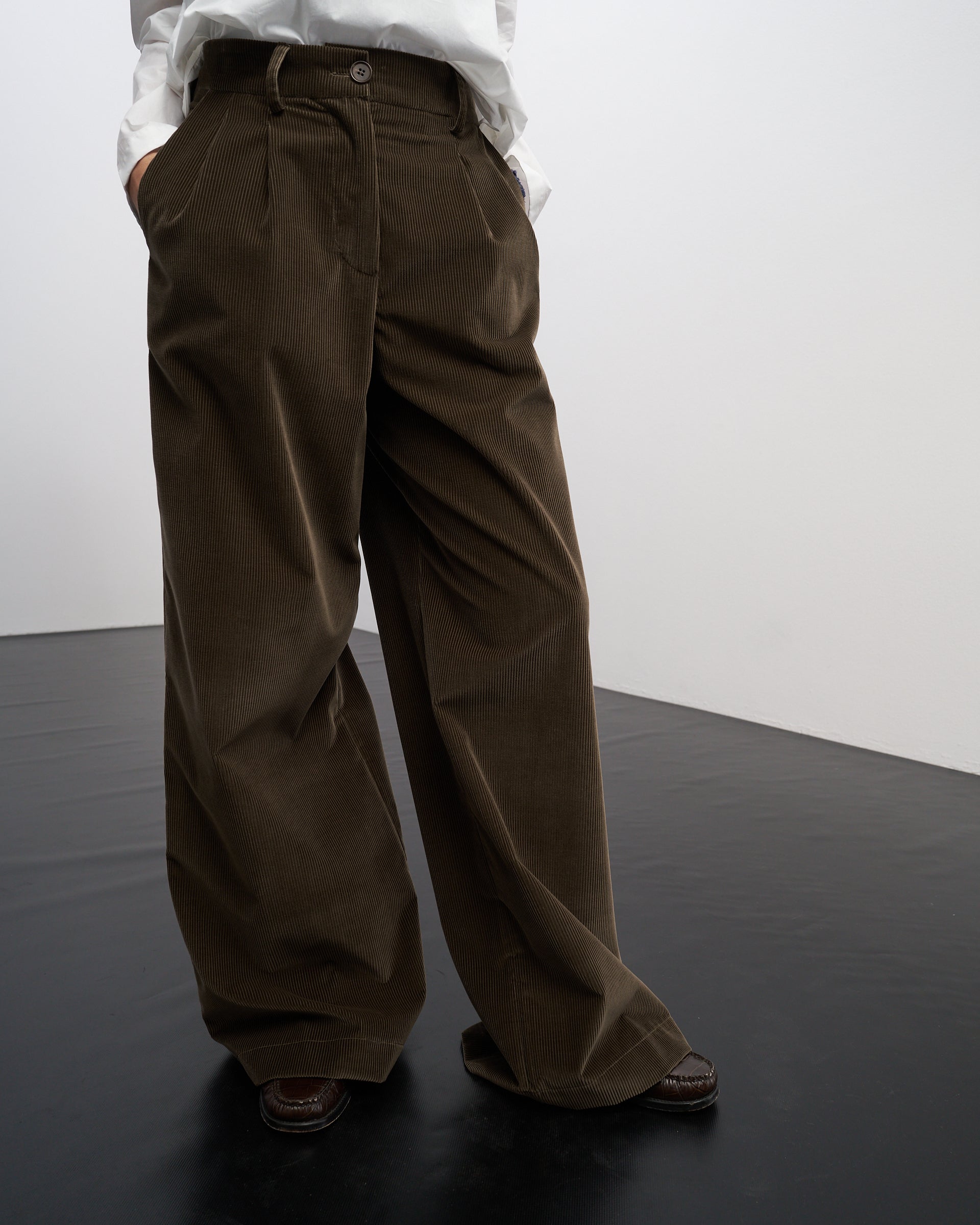 Un pantalone palazzo con gamba ampia, a vita alta, dai forti e irriverenti dettagli maschili, che incontrano la femminilità e l'eleganza senza tempo di un pantalone di qualità.