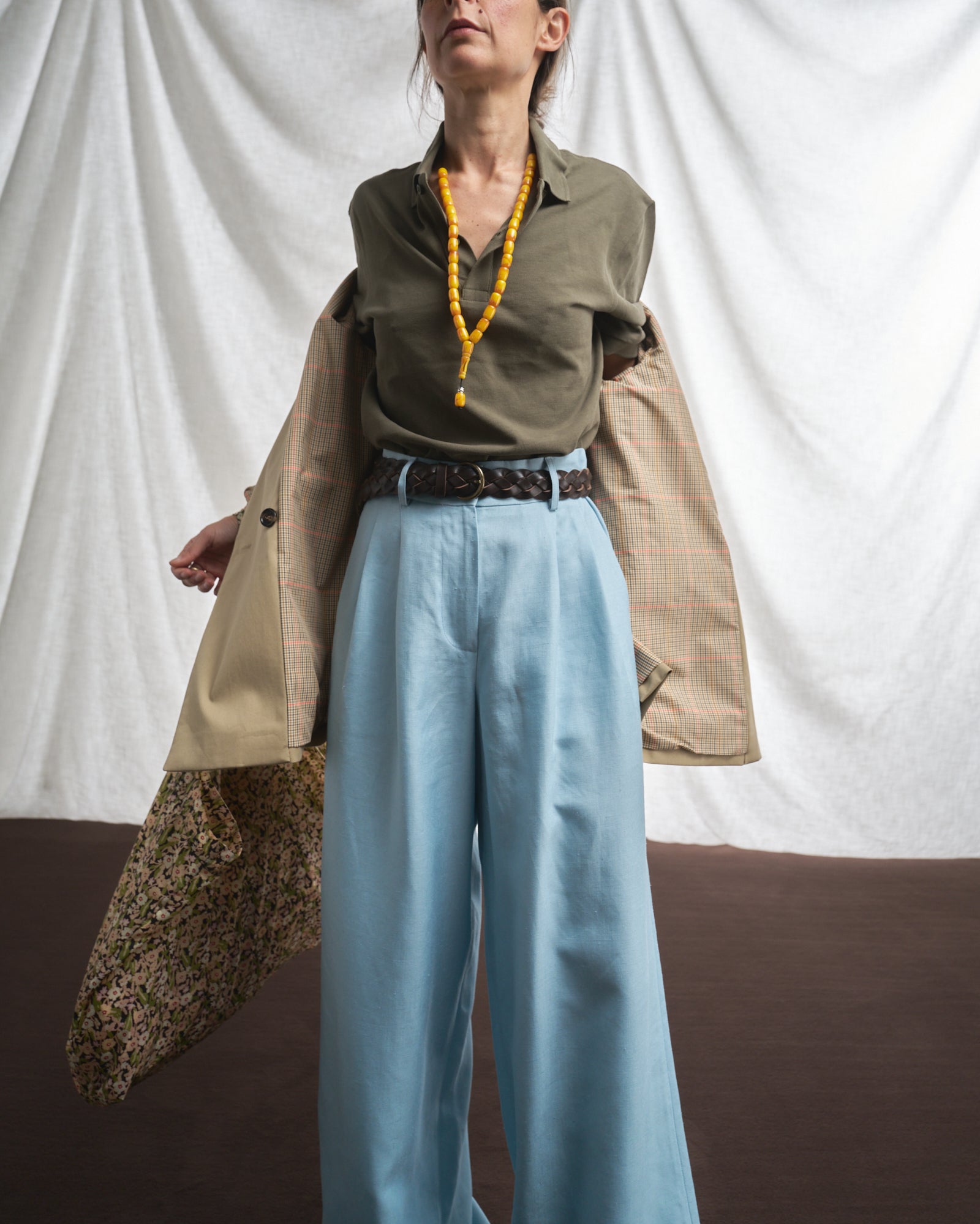 Il cannoncino anteriore inserito con due bottoni in tinta, la cucitura con ago singolo sulle spalle e l'orlo inferiore rifinito con cucitura stretta a doppio ago, garantiscono resistenza e durata nel tempo.