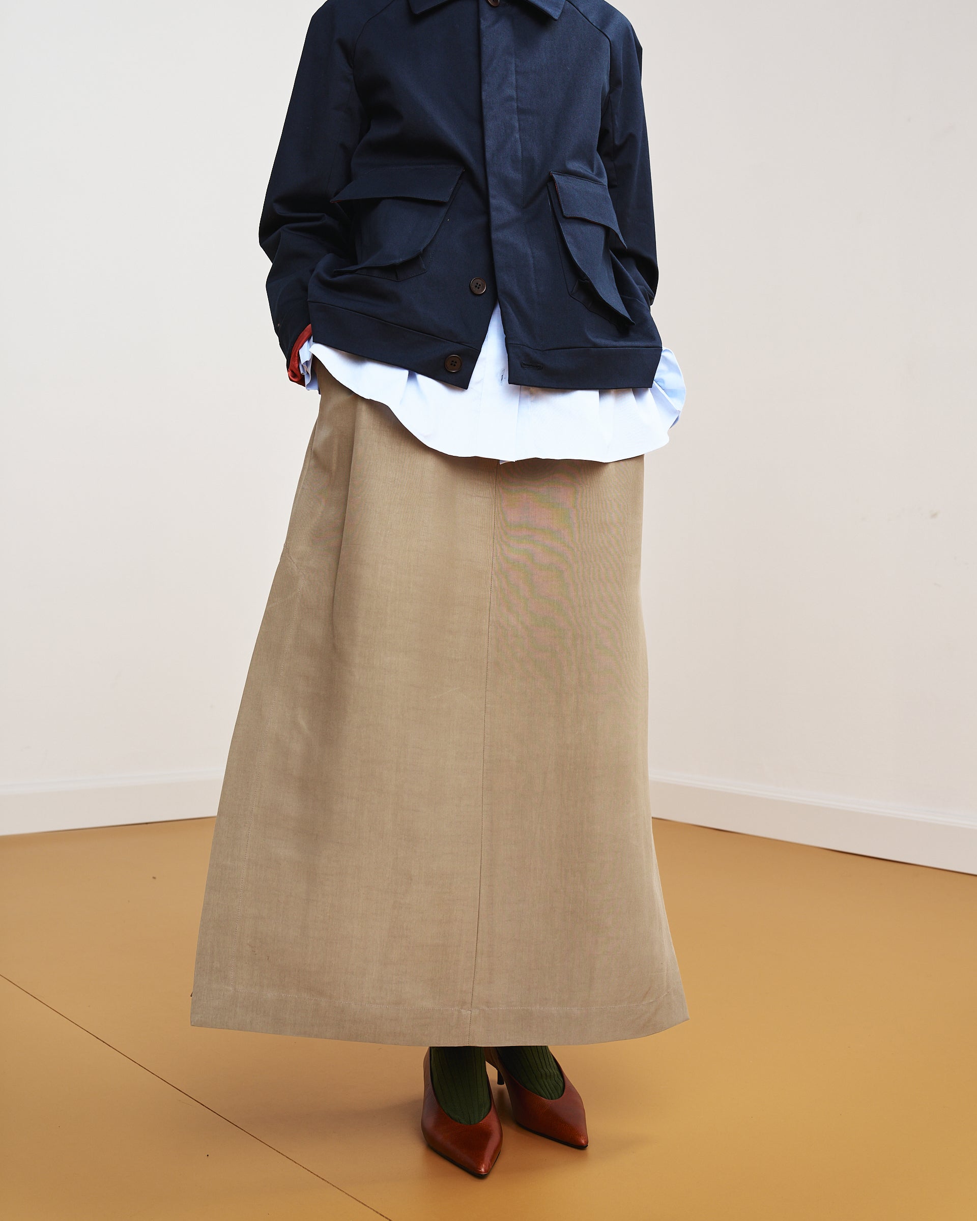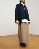L’allacciatura classica all’inglese con bottoni coperti ne definisce la linea più formale, mentre le due ampie tasche a soffietto con aletta sul davanti ne alleggeriscono il rigore.