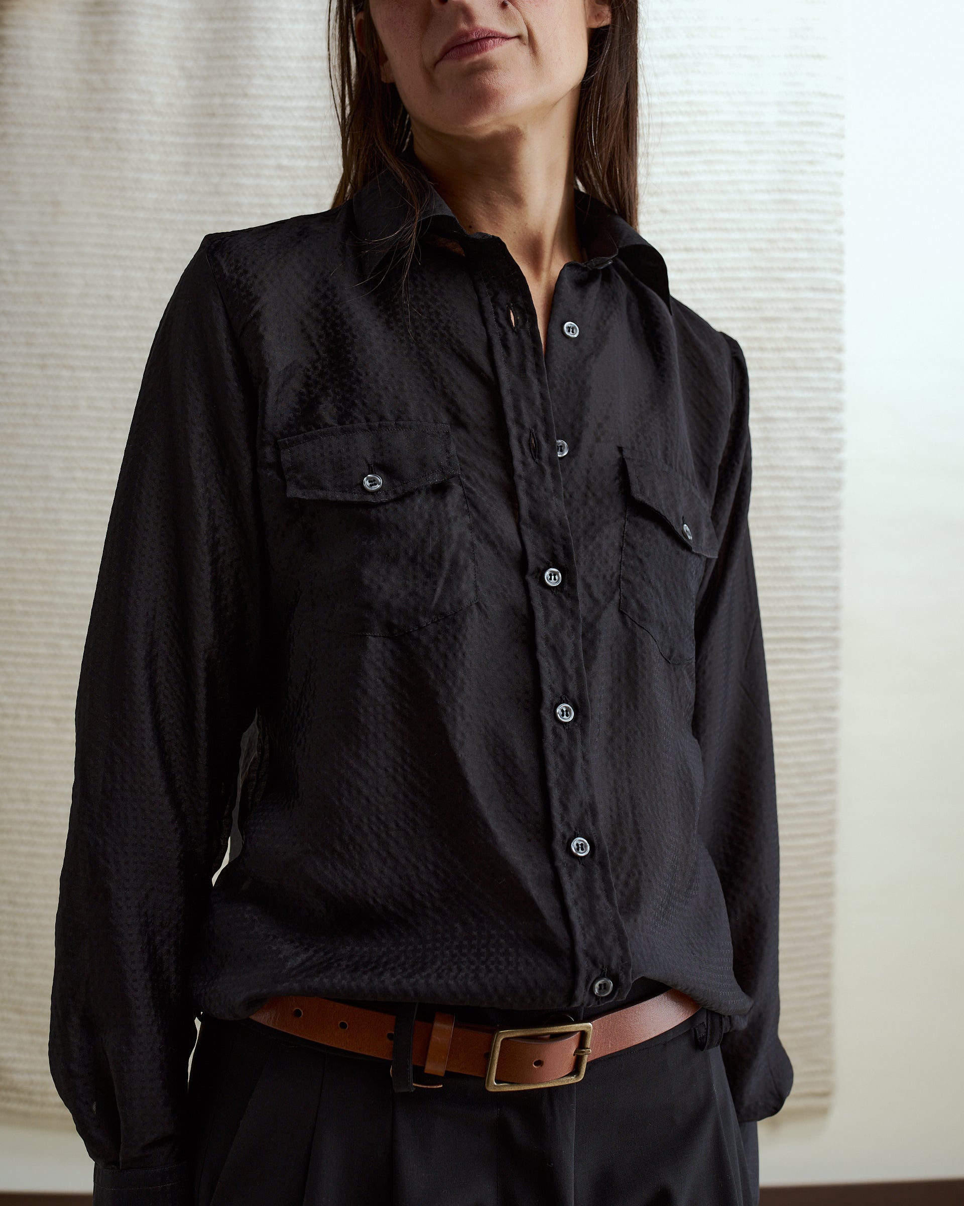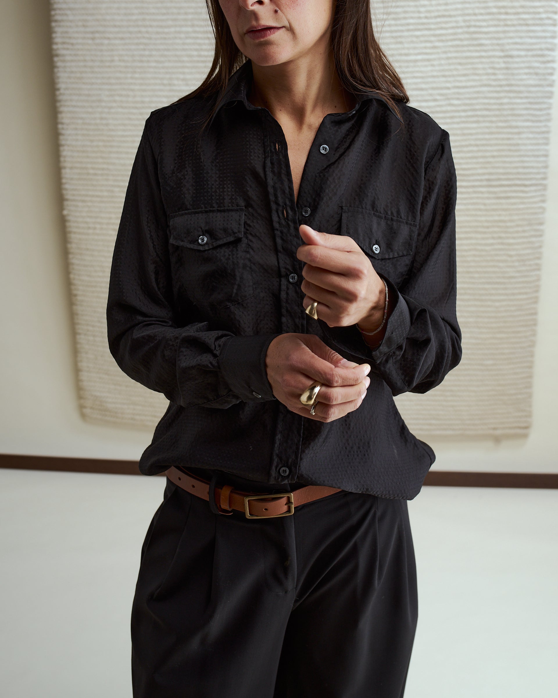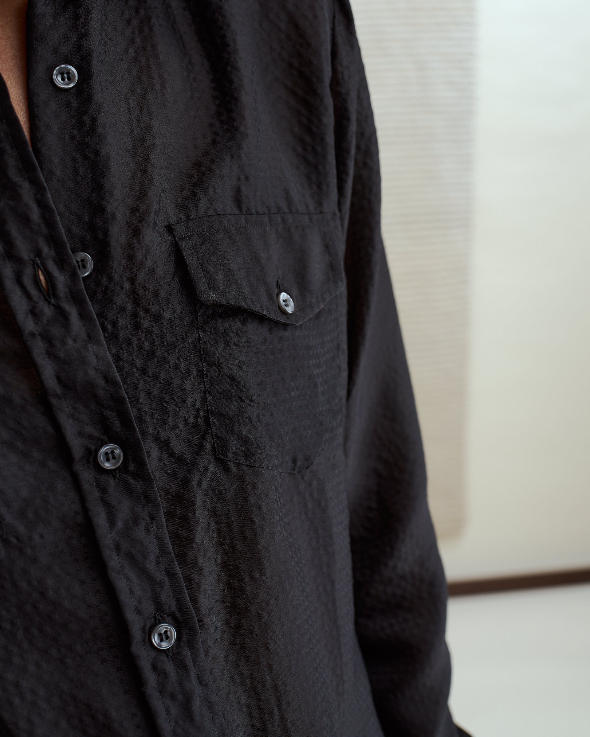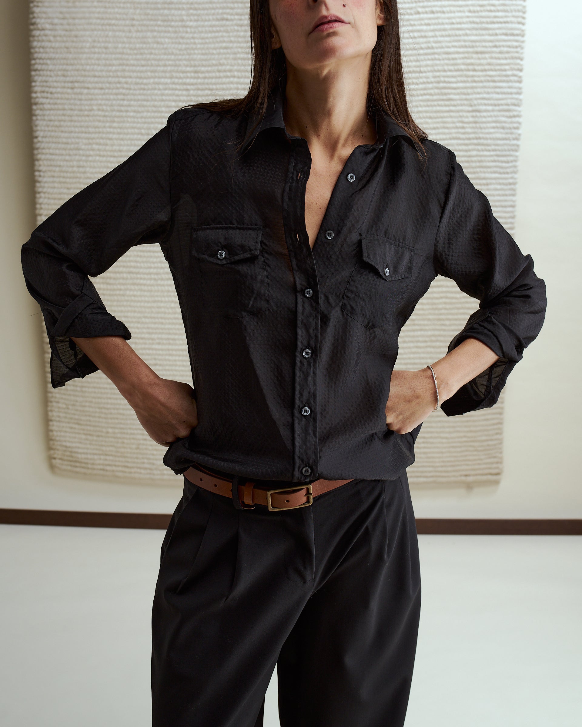 Ha il fit ideale, leggermente sfiancato, che ben accoglie la silhouette, i due taschini ad altezza del petto la rendono più cool e sportiva, ma il tessuto con cui è realizzata, una seta nera lavorata, la trasforma in un capo elegante e raffinato.
