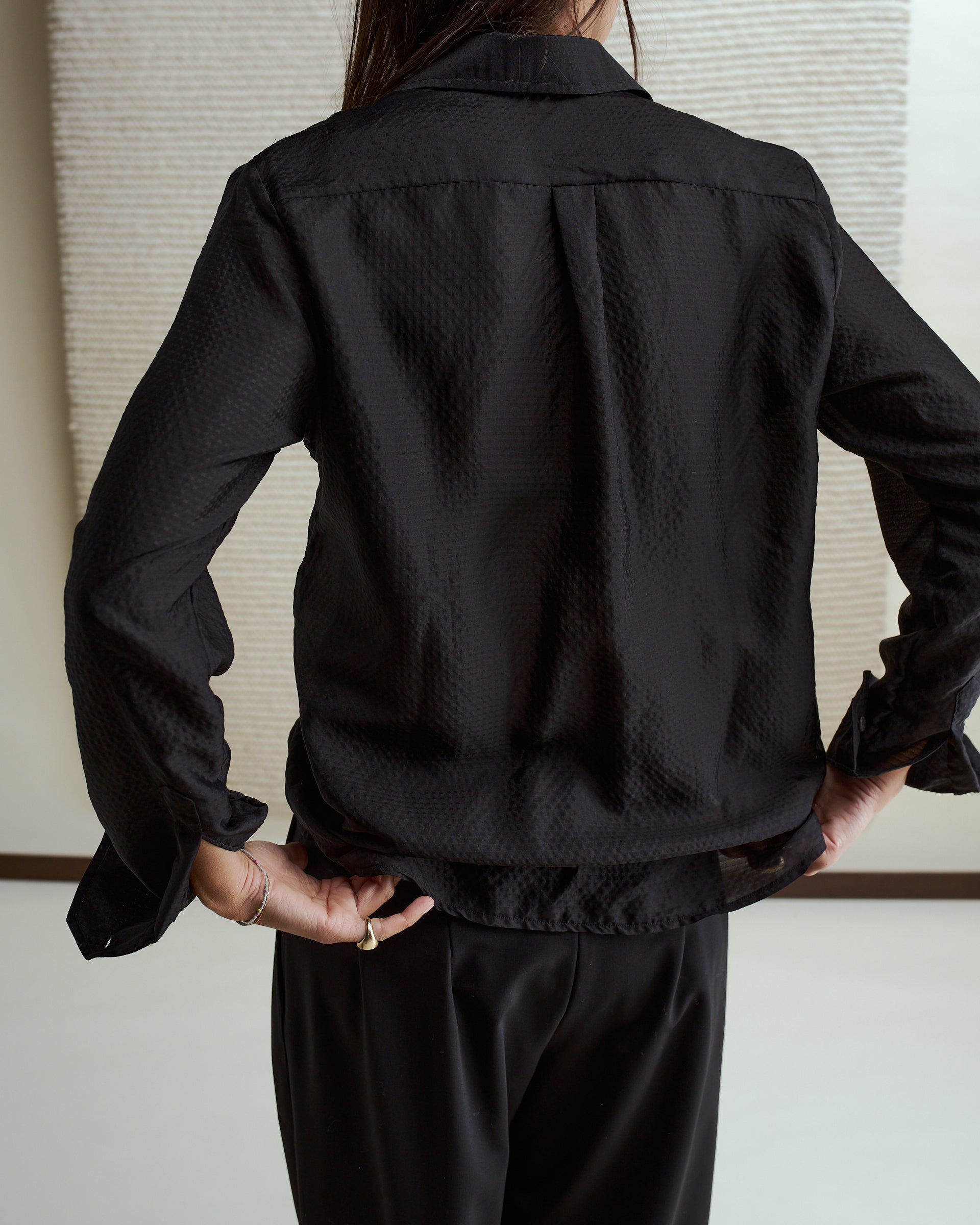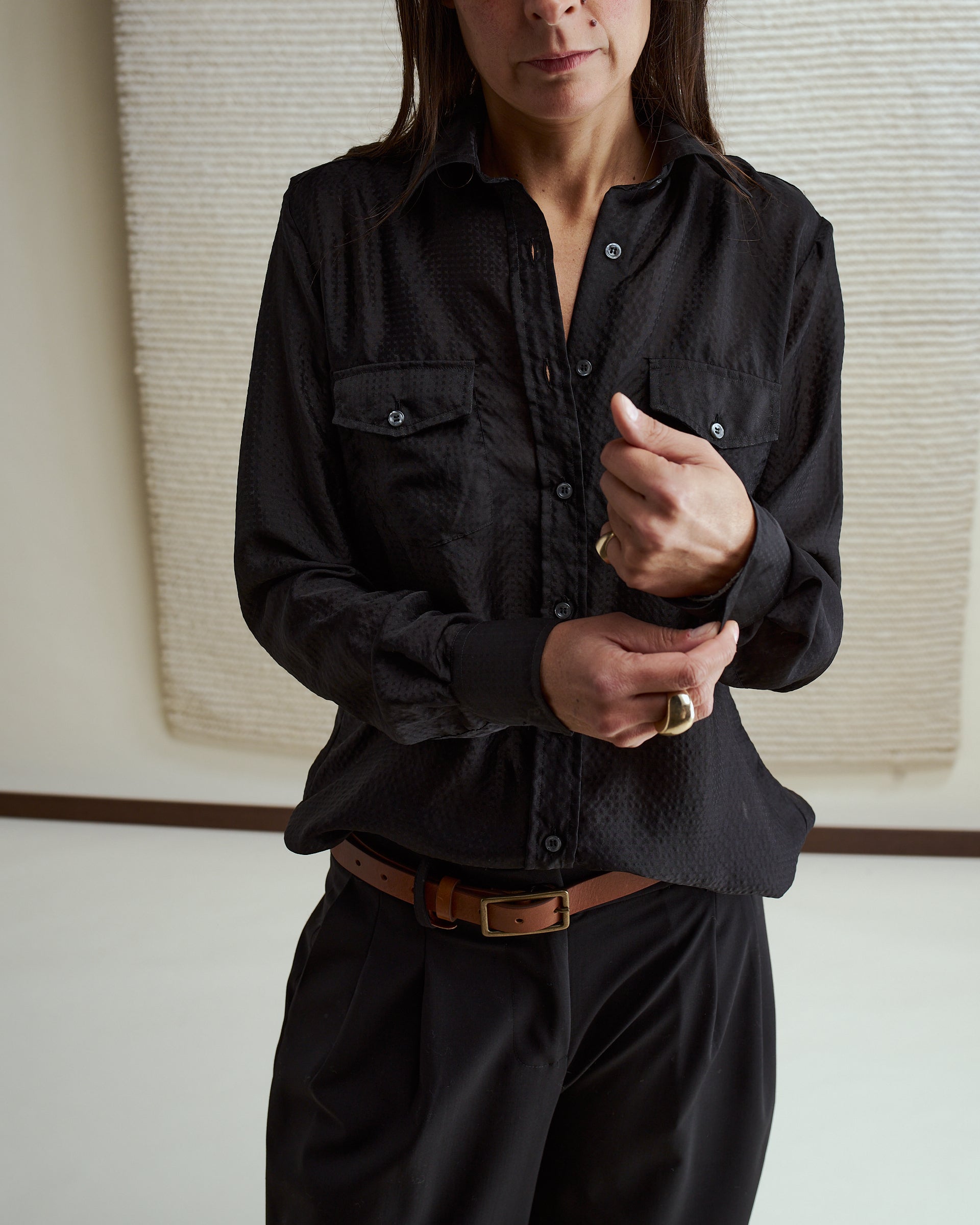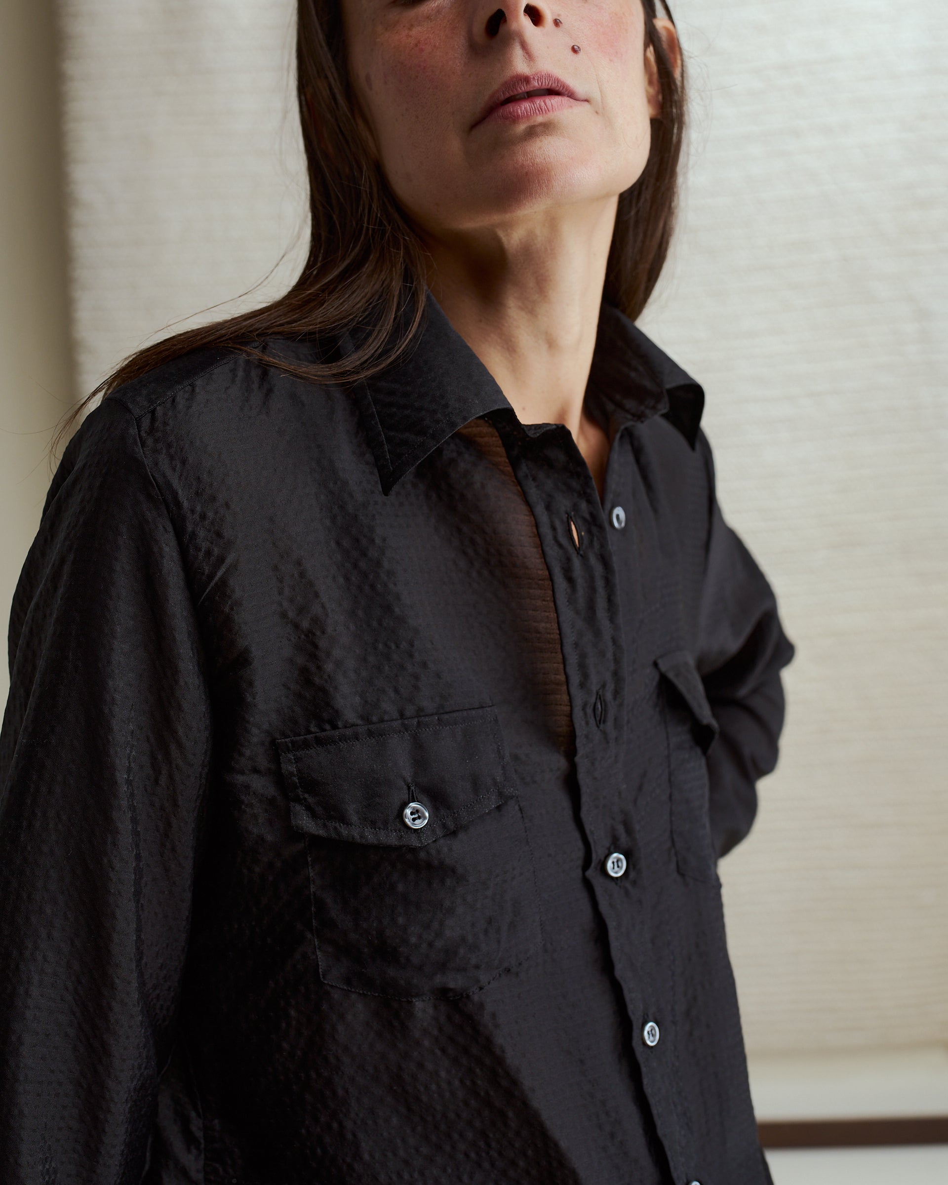 Ha il fit ideale, leggermente sfiancato, che ben accoglie la silhouette, i due taschini ad altezza del petto la rendono più cool e sportiva, ma il tessuto con cui è realizzata, una seta nera lavorata, la trasforma in un capo elegante e raffinato.
