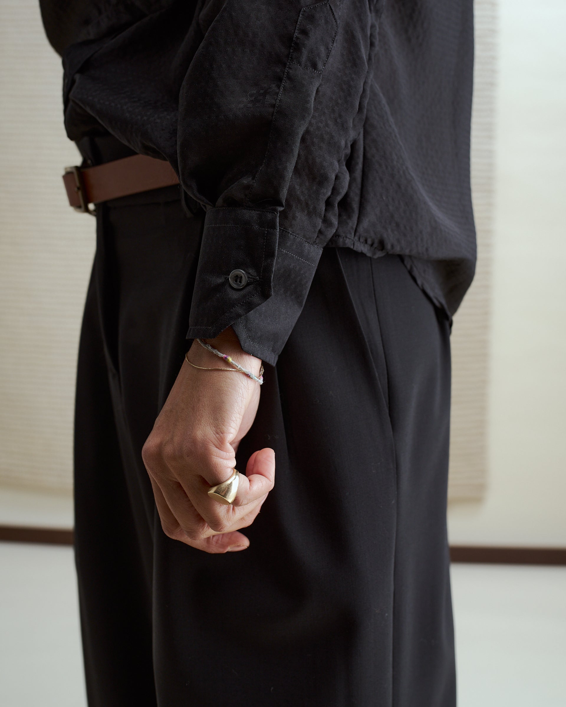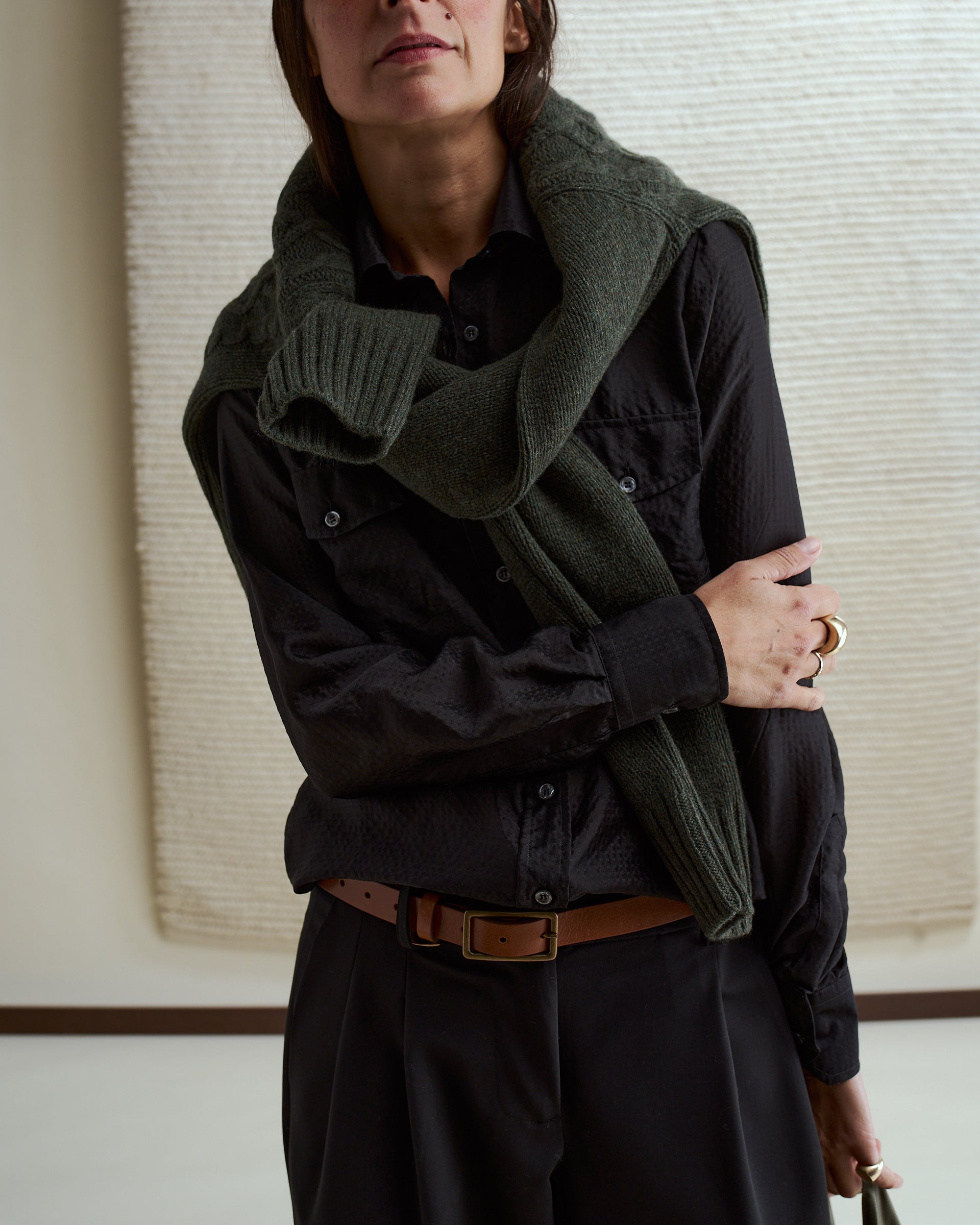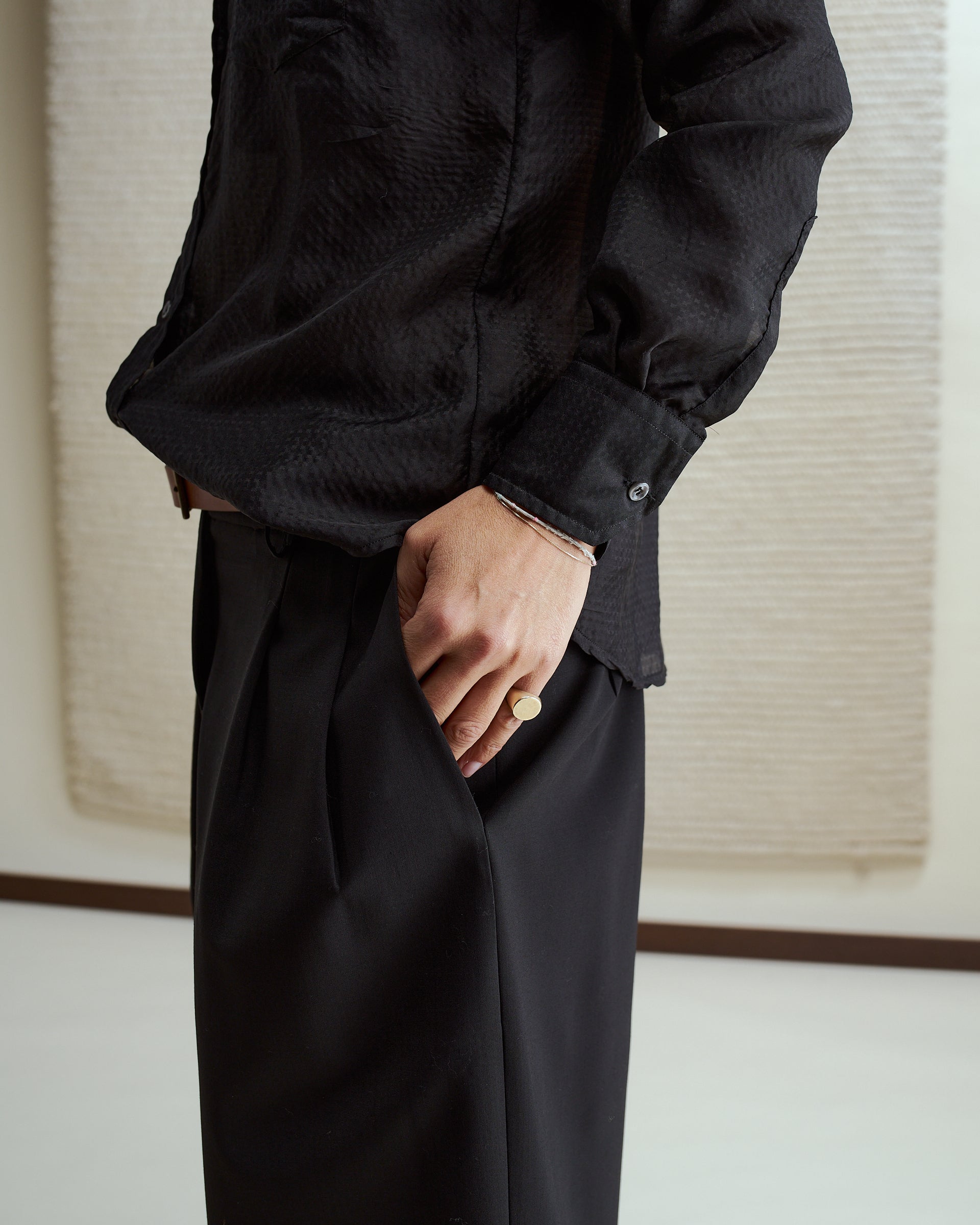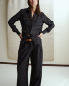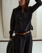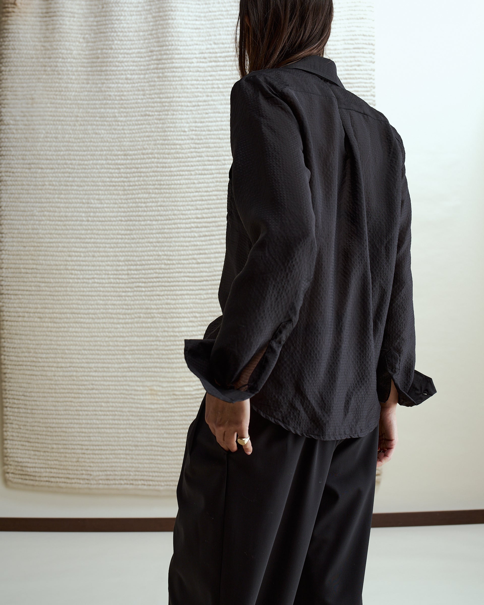 Ha il fit ideale, leggermente sfiancato, che ben accoglie la silhouette, i due taschini ad altezza del petto la rendono più cool e sportiva, ma il tessuto con cui è realizzata, una seta nera lavorata, la trasforma in un capo elegante e raffinato.