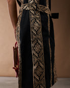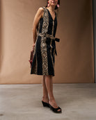 Uno classico abito a tunica, con ampio scollo a V, spalline larghe, comoda allacciatura sul fianco con zip, lunghezza al ginocchio e l'immancabile fusciacca, da allacciare per sottolineare il punto vita e modificare la silhouette del vestito a vostro piacimento. Gli ampi spacchi laterali sono il tocco iper femminile di questo abito solo apparentemente rigoroso.