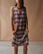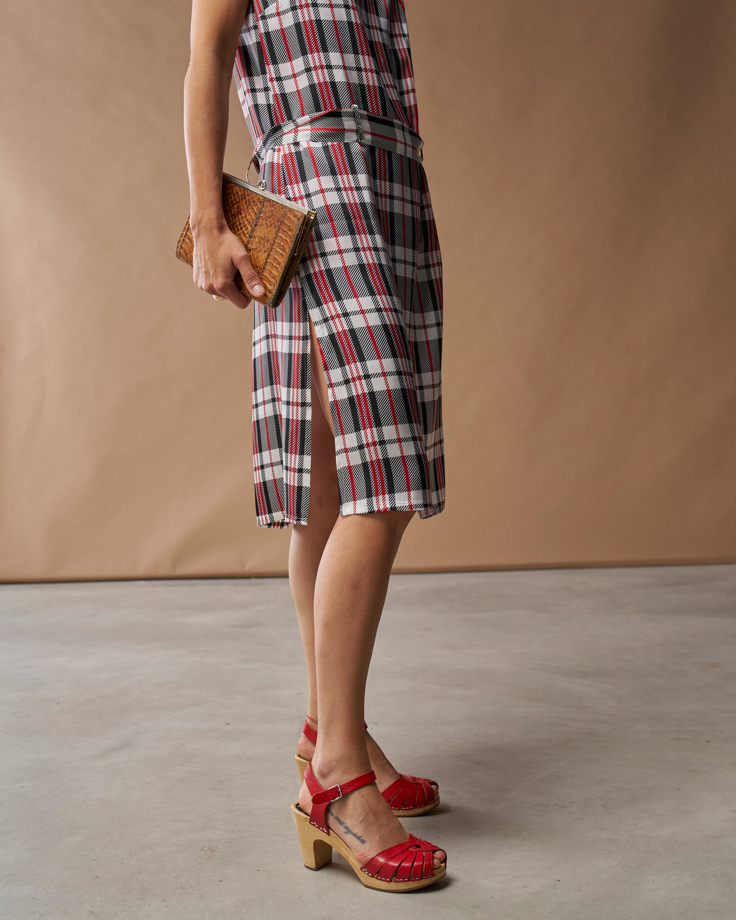 Uno classico abito a tunica, con ampio scollo a V, spalline larghe, comoda allacciatura sul fianco con zip, lunghezza al ginocchio e l'immancabile fusciacca, da allacciare per sottolineare il punto vita e modificare la silhouette del vestito a vostro piacimento. Gli ampi spacchi laterali sono il tocco iper femminile di questo abito solo apparentemente rigoroso.