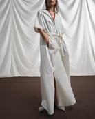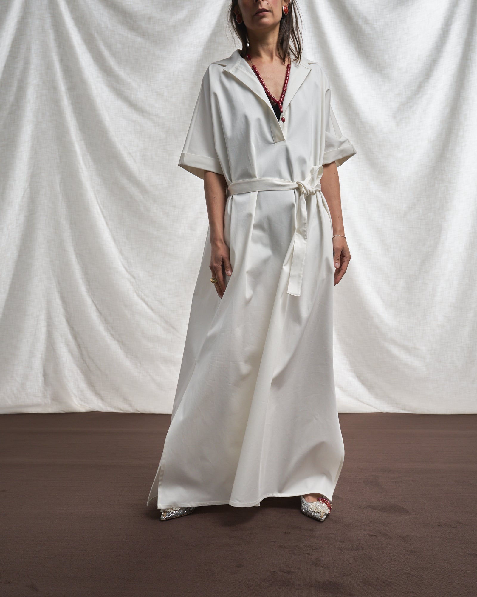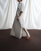 Lo scollo a V e il colletto classico, definiscono la pulizia della silhouette di questo abito lungo, con maniche a kimono, ampio e svasato.