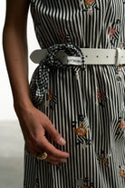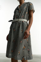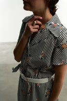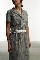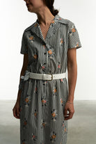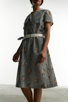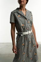 Un abito ricco di dettagli sartoriali, come la mezzaluna sulle spalle con una leggera arricciatura al centro che impreziosisce la silhouette di questo abito a mezza manica. Il colletto, che strizza l'occhio ai modelli bowling degli anni '50, lo rende irriverente, ma super chic.