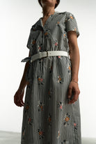 I bottoncini in madreperla, i due passanti piatti sui fianchi e le tasche a filo lo rendono un abito pratico da indossare tutti i giorni.