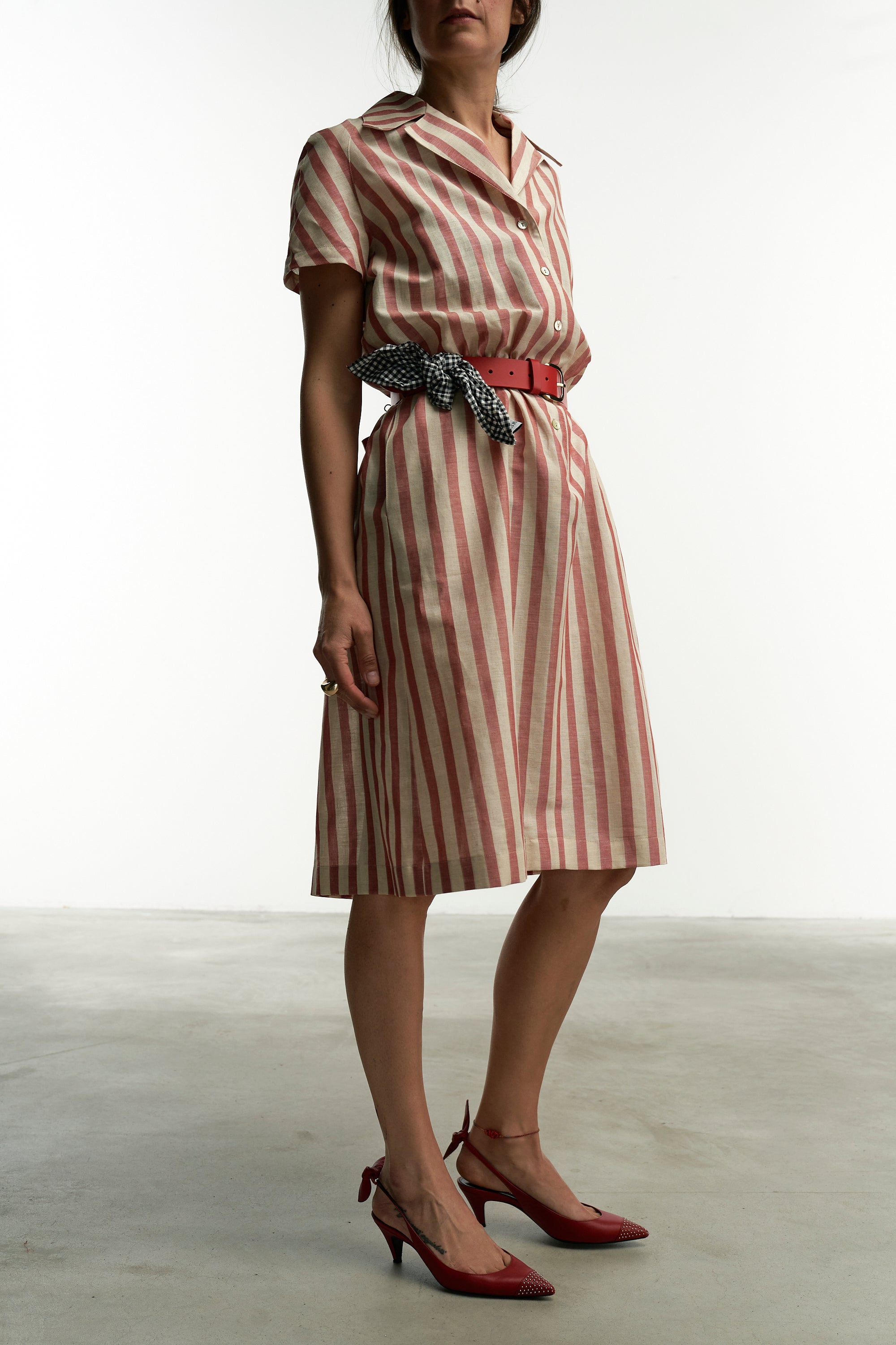 I bottoncini in madreperla, i due passanti piatti sui fianchi e le tasche a filo lo rendono un abito pratico da indossare tutti i giorni.