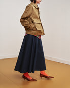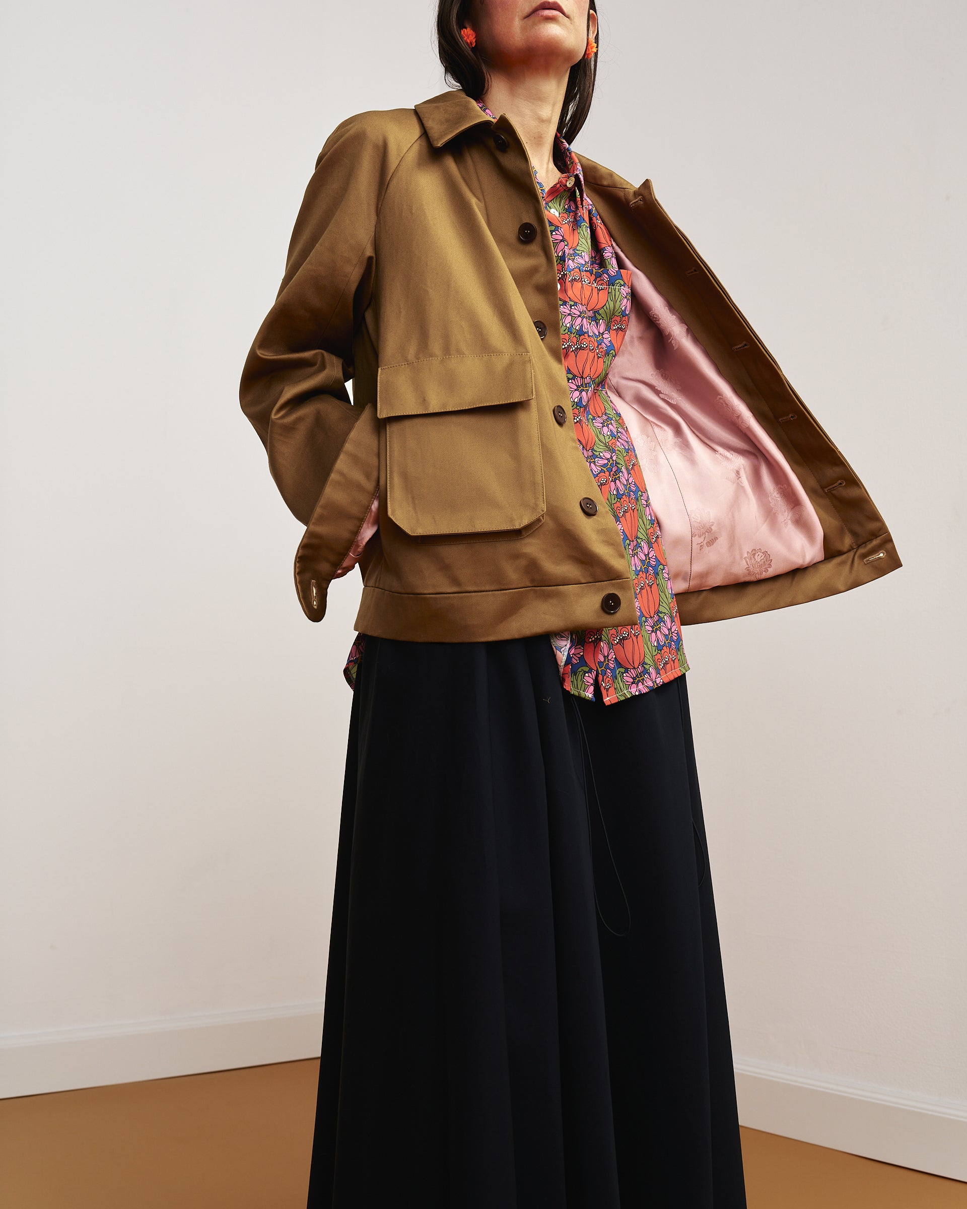 Realizzato in un cotone sostenuto di alta qualità, con fodera in viscosa color mattone a contrasto.