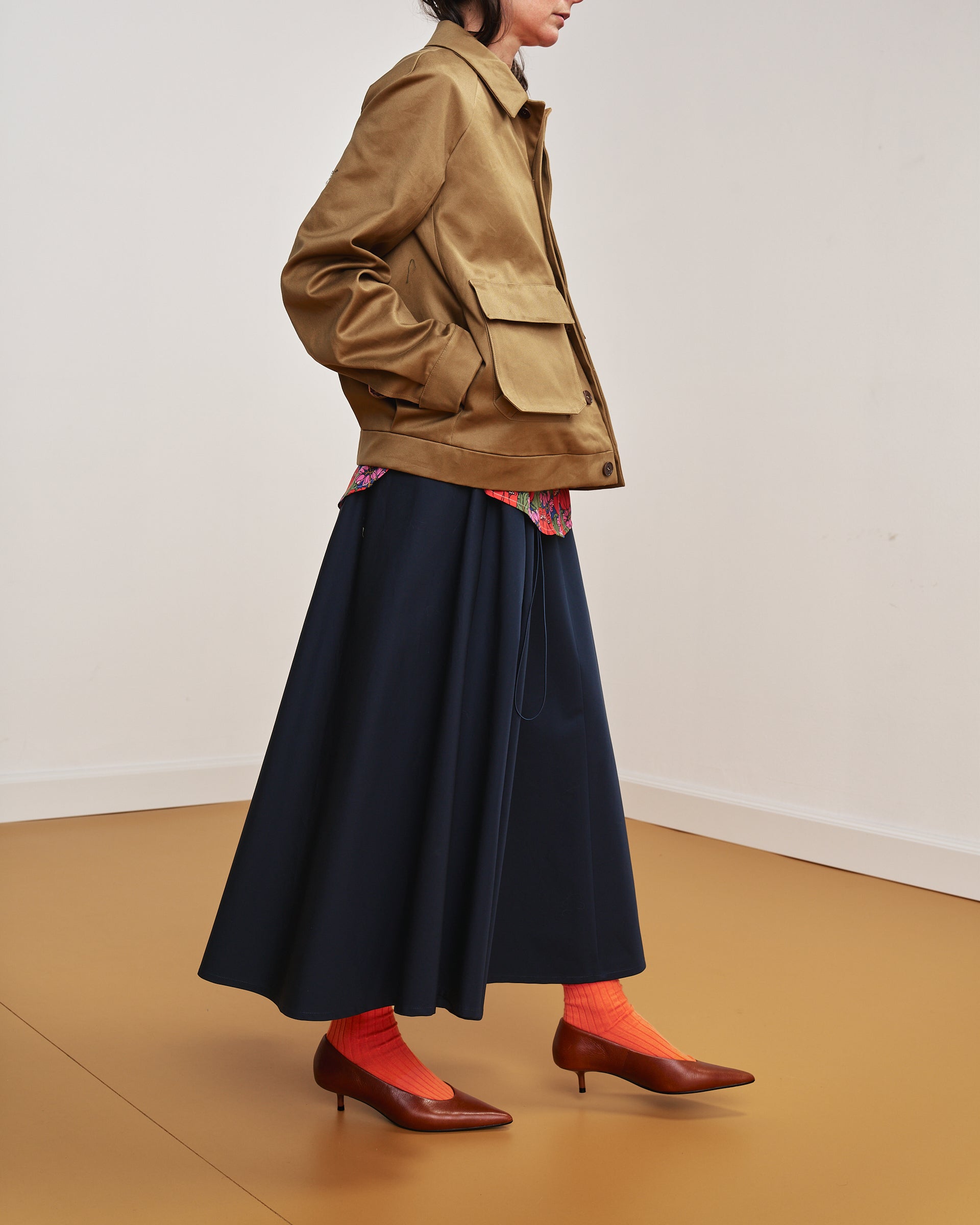 L’allacciatura classica all’inglese con bottoni coperti ne definisce la linea più formale, mentre le due ampie tasche a soffietto con aletta sul davanti ne alleggeriscono il rigore.