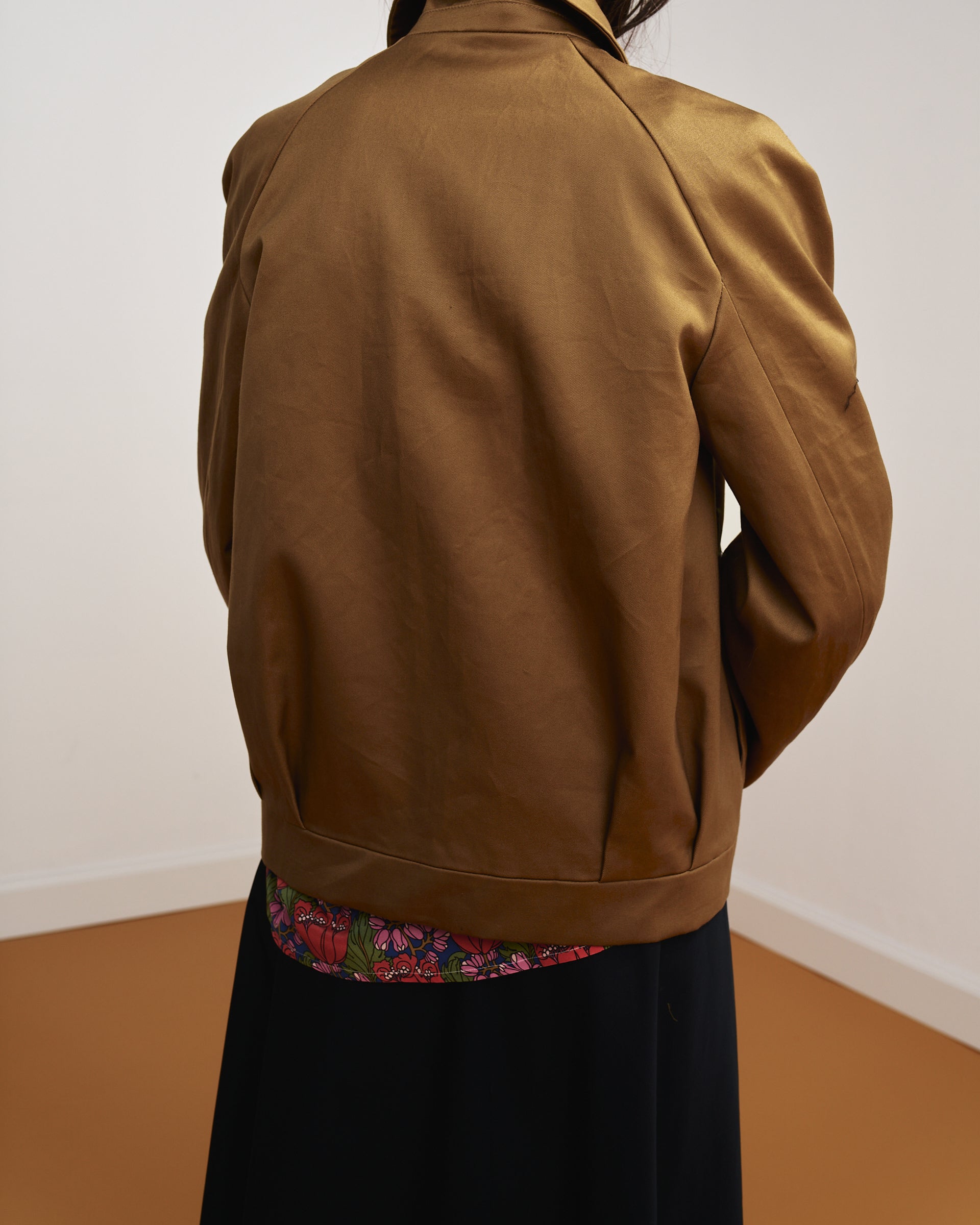 Sul retro, alcune pieghe che partono dalla cintura in vita modificano il volume del capo sulla schiena, creando movimento.