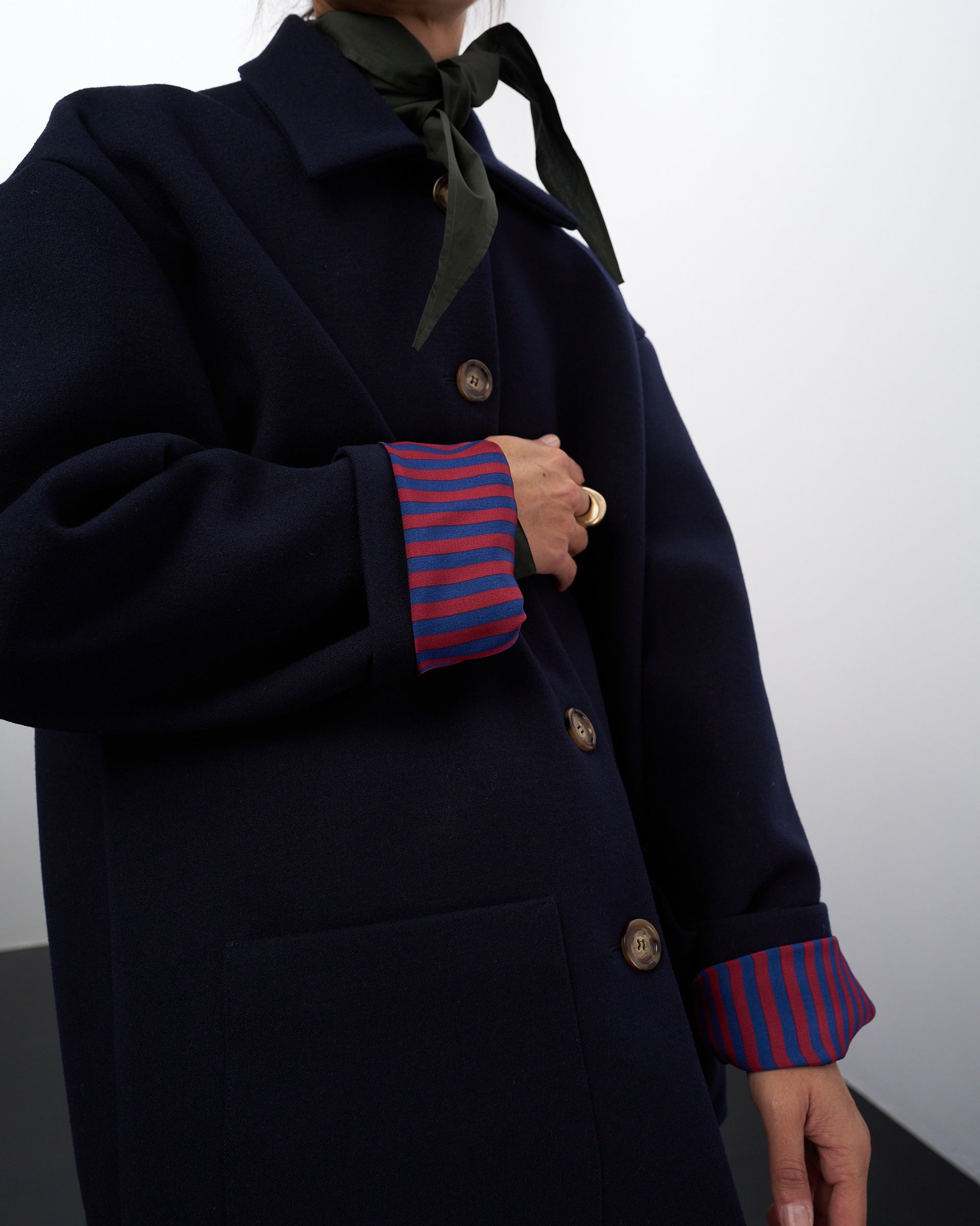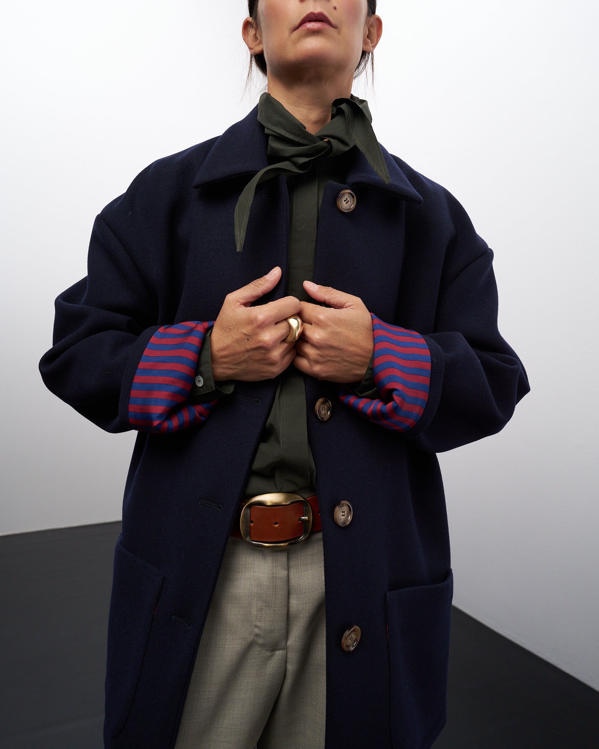 Allacciatura con bottoni sul davanti, due ampie tasche frontali, un colletto semplice, le maniche dritte e le fodere a contrasto in seta e viscosa, sono dettagli sartoriali che rendono questo giaccone super chic, ma adatto alla vita contemporanea.