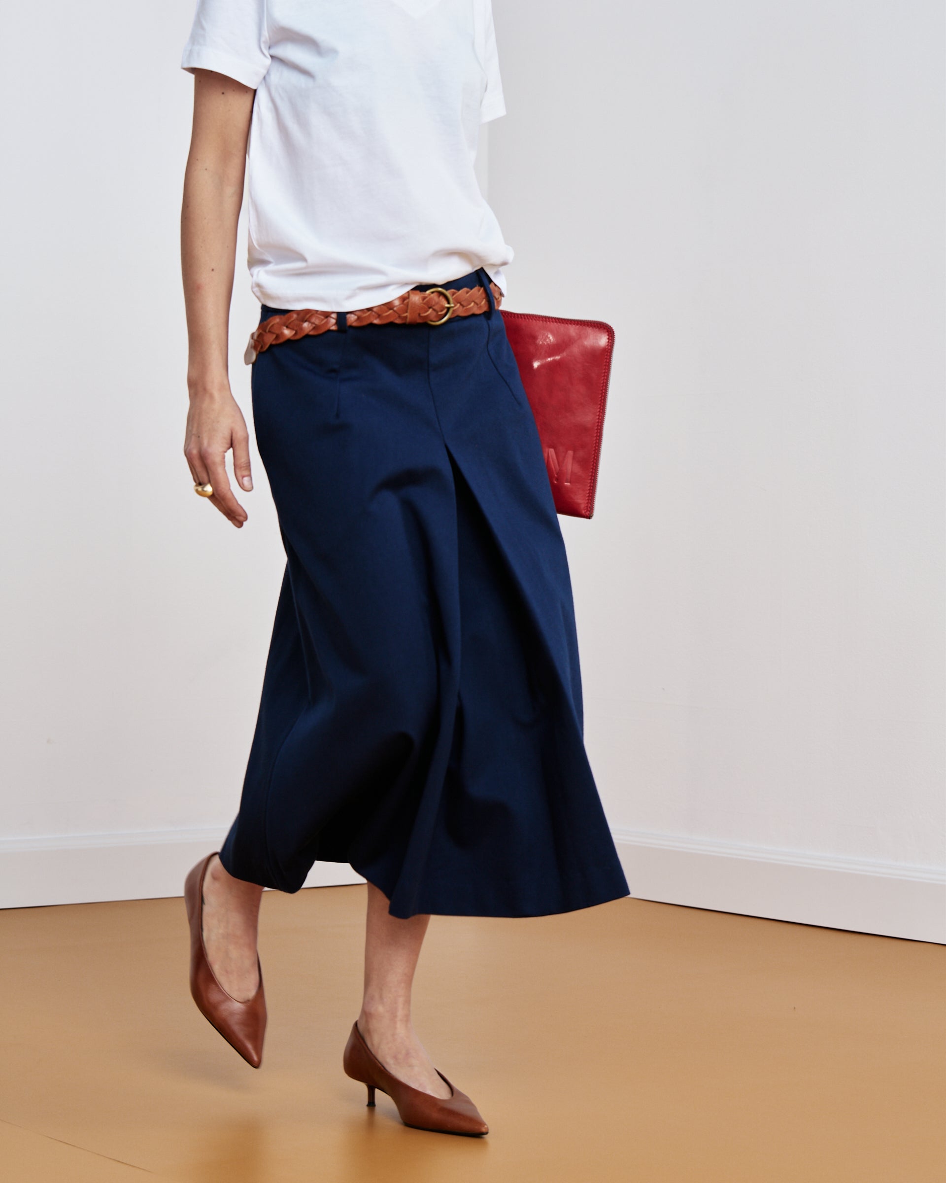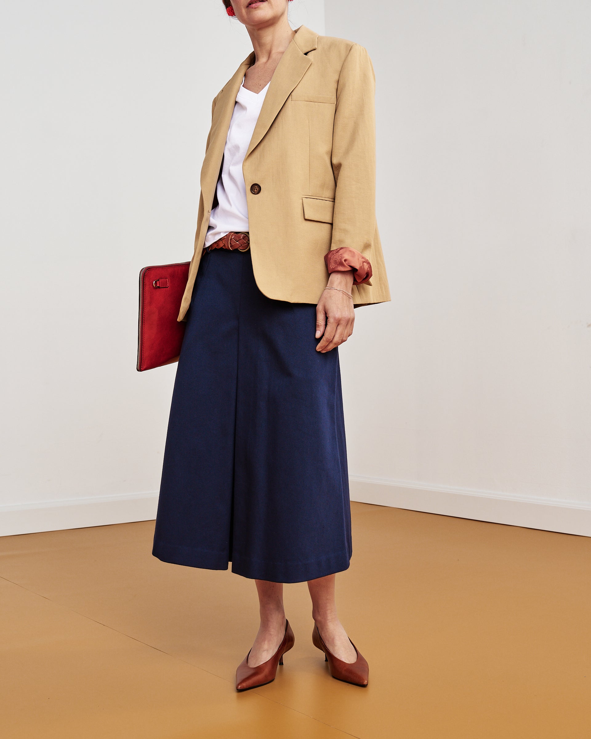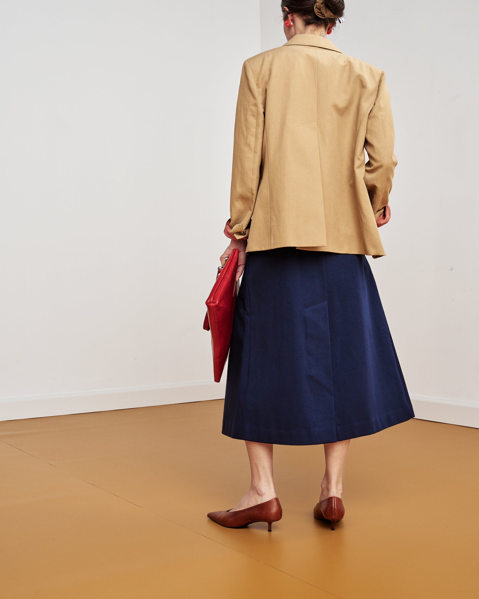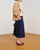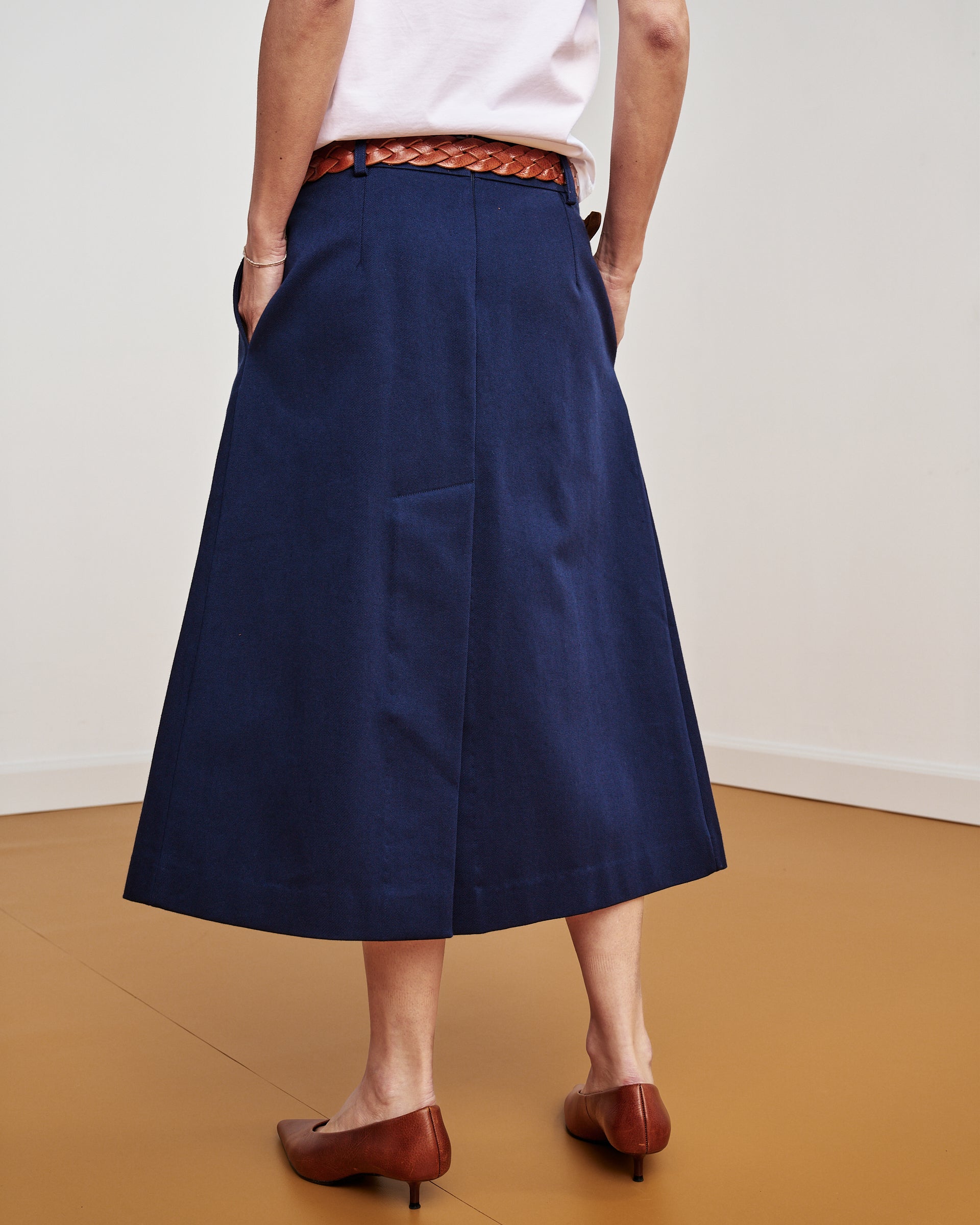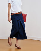 È una gonna midi leggermente svasata, caratterizzata da un’ampia piega sul davanti e da uno spacco sormontato sul retro. Presenta chiusura con zip sul dietro e cintura alta in vita con passanti, pensata per essere indossata anche con le nostre cinture.